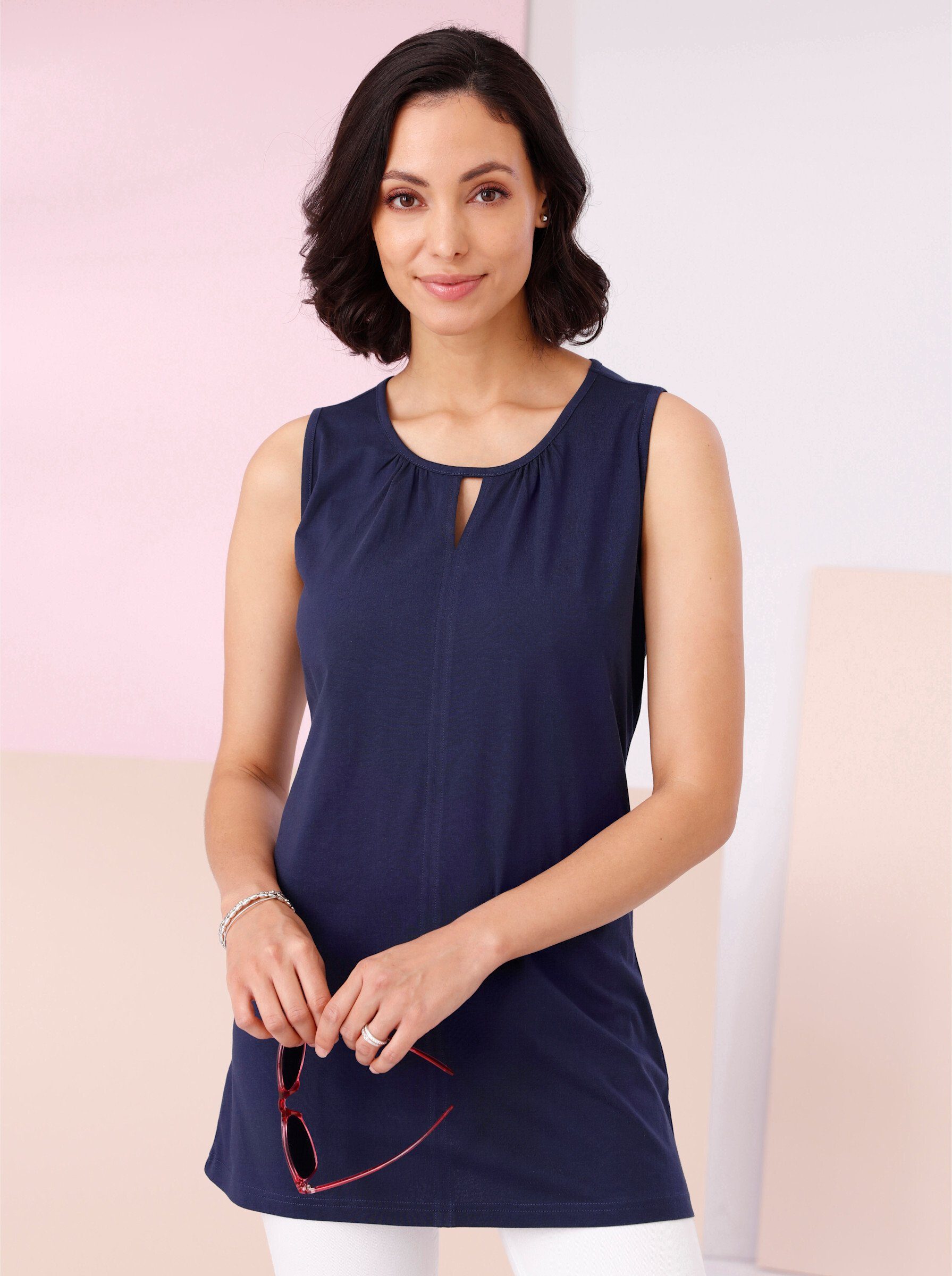 Luftiges Longtop mit kleinem V und dezenter Raffung am paspelierten Rundhals-Ausschnitt. Durch den etwas längeren Schnitt in dezenter A-Form überspielt es geschickt Pölsterchen an Bauch, Hüften und Po.