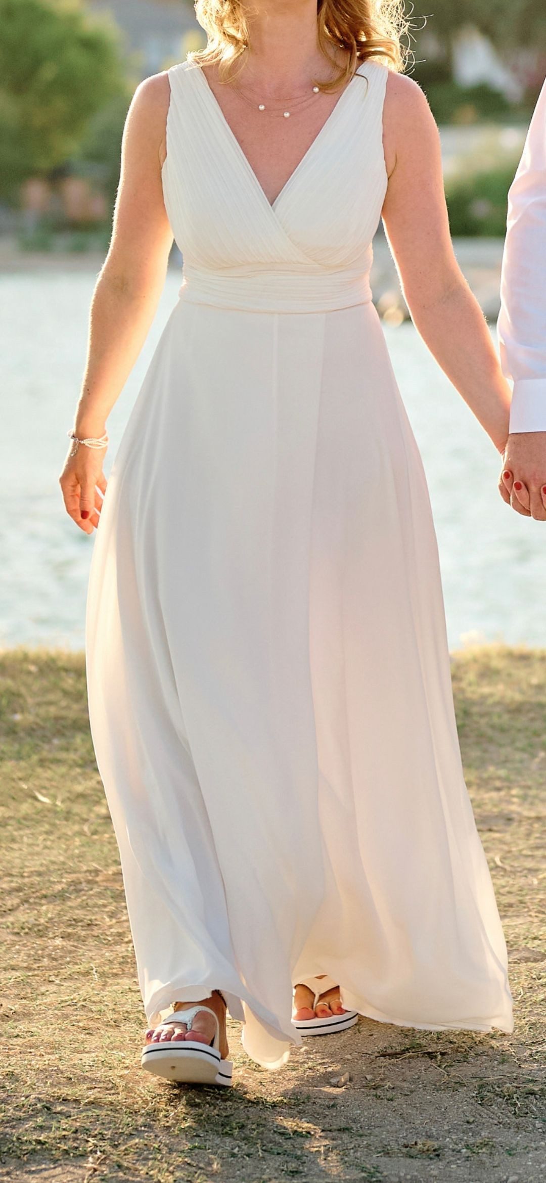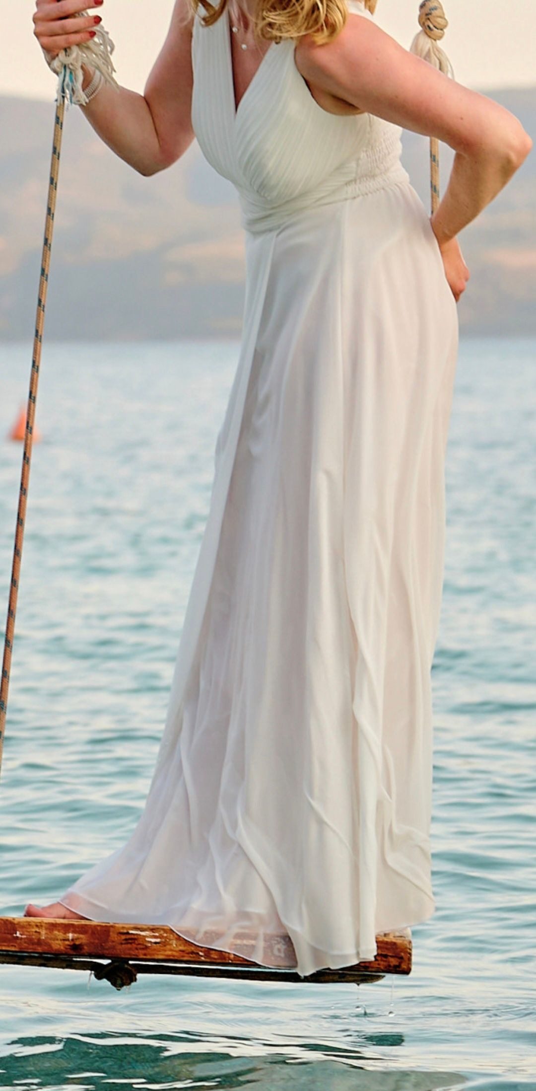 Es war mein Brautkleid bei unserer Hochzeit zu zweit am Strand. Dafür war es perfekt: es ist bequem, locker-leicht, unkompliziert anzuziehen und ohne verrutschenden Schnickschnack. Ohne Trauzeugin o.ä. sind diese Eigenschaften gold Wert ;) Es ist anzumerken (das steht nämlich nicht in der Beschreibung), dass es eingenäht Cups hat, was ich aber als weitere Pluspunkt empfinde. Bezüglich anderer Bewertungen zum Thema Länge: Ja, es ist ursprünglich sehr lang - das ist aber meines Wissens nach bei Abendkleidern normal, eben damit sie individuell, auch passend zum Schuhwerk, gekürzt werden können. Ich bin 1.63m und hatte Flip Flops an. Meine Schneiderin hatte es mir innerhalb kürzester Zeit gekürzt und es hat sich selbstverständlich dadurch nichts an Passform, Schnitt und Stil des Kleides verändert. P.S. Das Kleid verträgt auch Salzwasser ;)