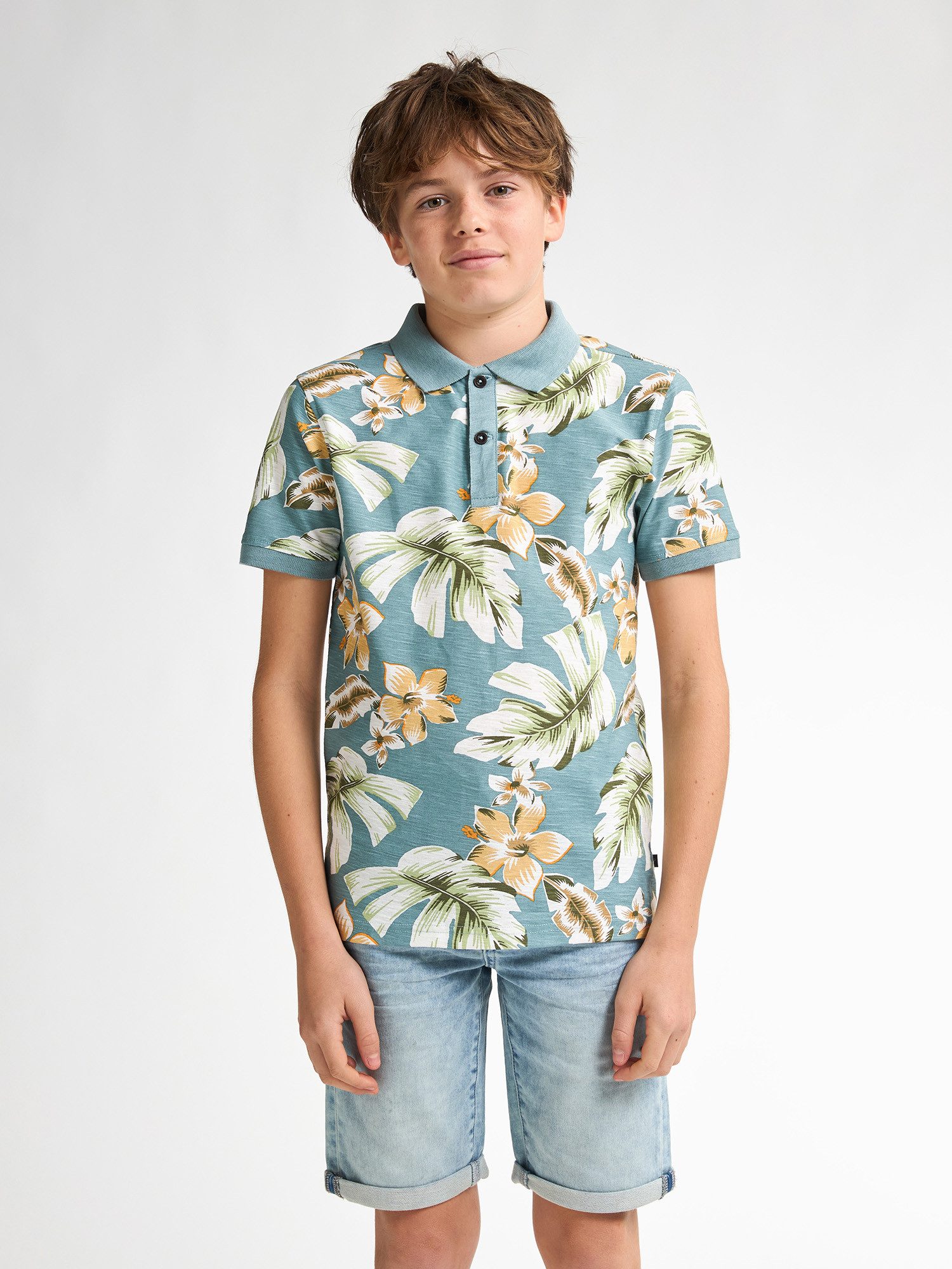 Poloshirt mit Allover-Print, offenem Kragen und Knopfleiste. Dieses Poloshirt hat einen unifarbenen Kragen und Ärmelbündchen. Das Poloshirt ist in verschiedenen Farben erhältlich. Du kannst dich nicht zwischen zwei Größen entscheiden? Wähle dann stets die größere Größe.
