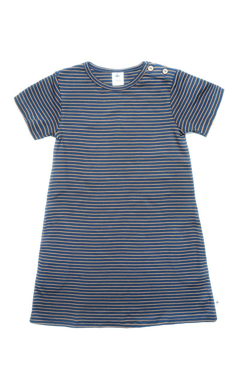 Hochwertiges Rippjersey Kurzarmkleid aus 100% Bio-Baumwolle (kbA) in einem mitternachts Indigo mit feinen ingwerfarbenen Nadelstreifen. Besonders atmungsaktiv und angenehm zu tragen, mit Holzknöpfen an der Schulter für leichteres Ankleiden.