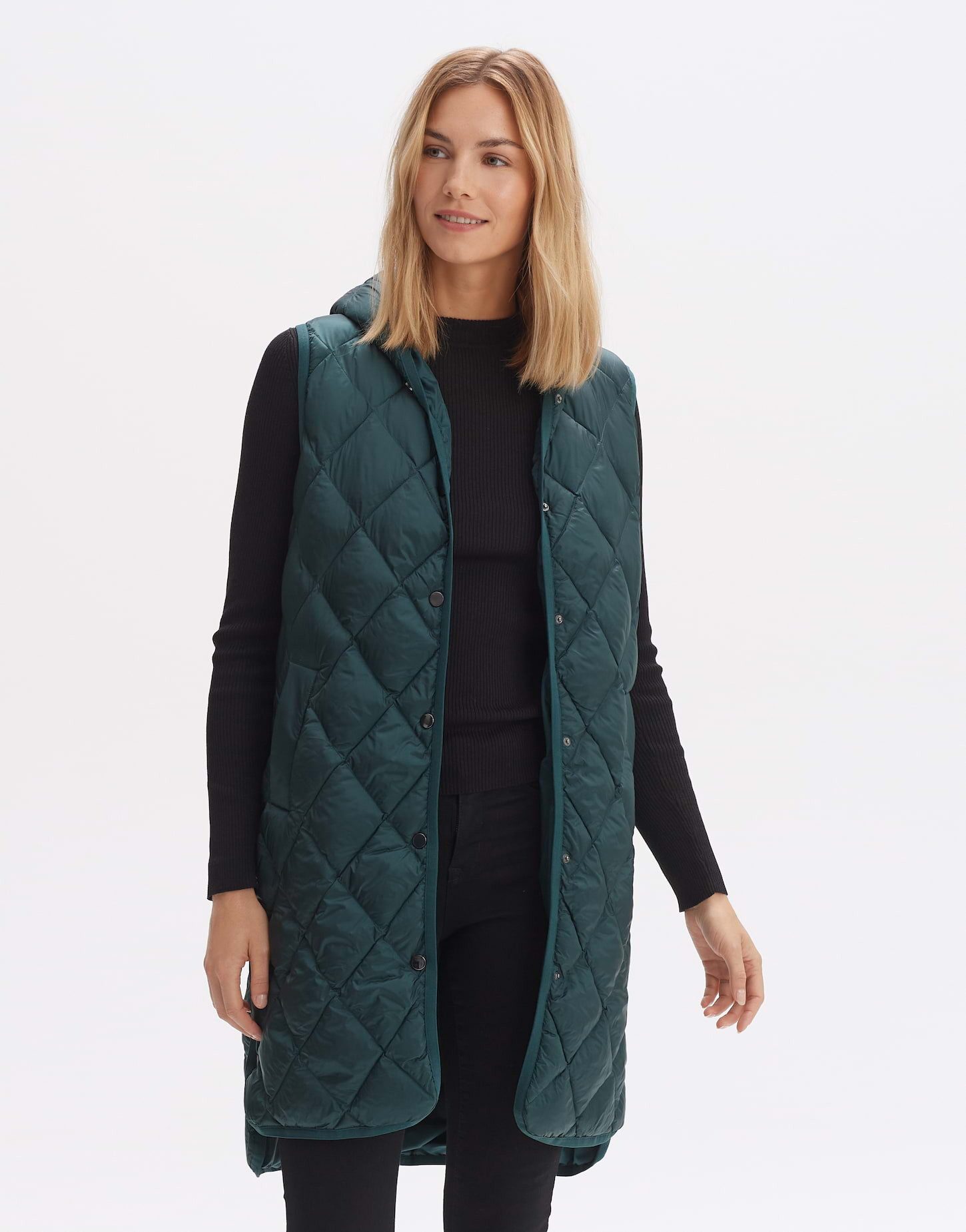 Die Weste setzt auf ein großes Steppmuster und eine lange Silhouette. Die wetterfesten Eigenschaften machen die Weste zu einem beliebten Überzieher für die kälteren Monate.