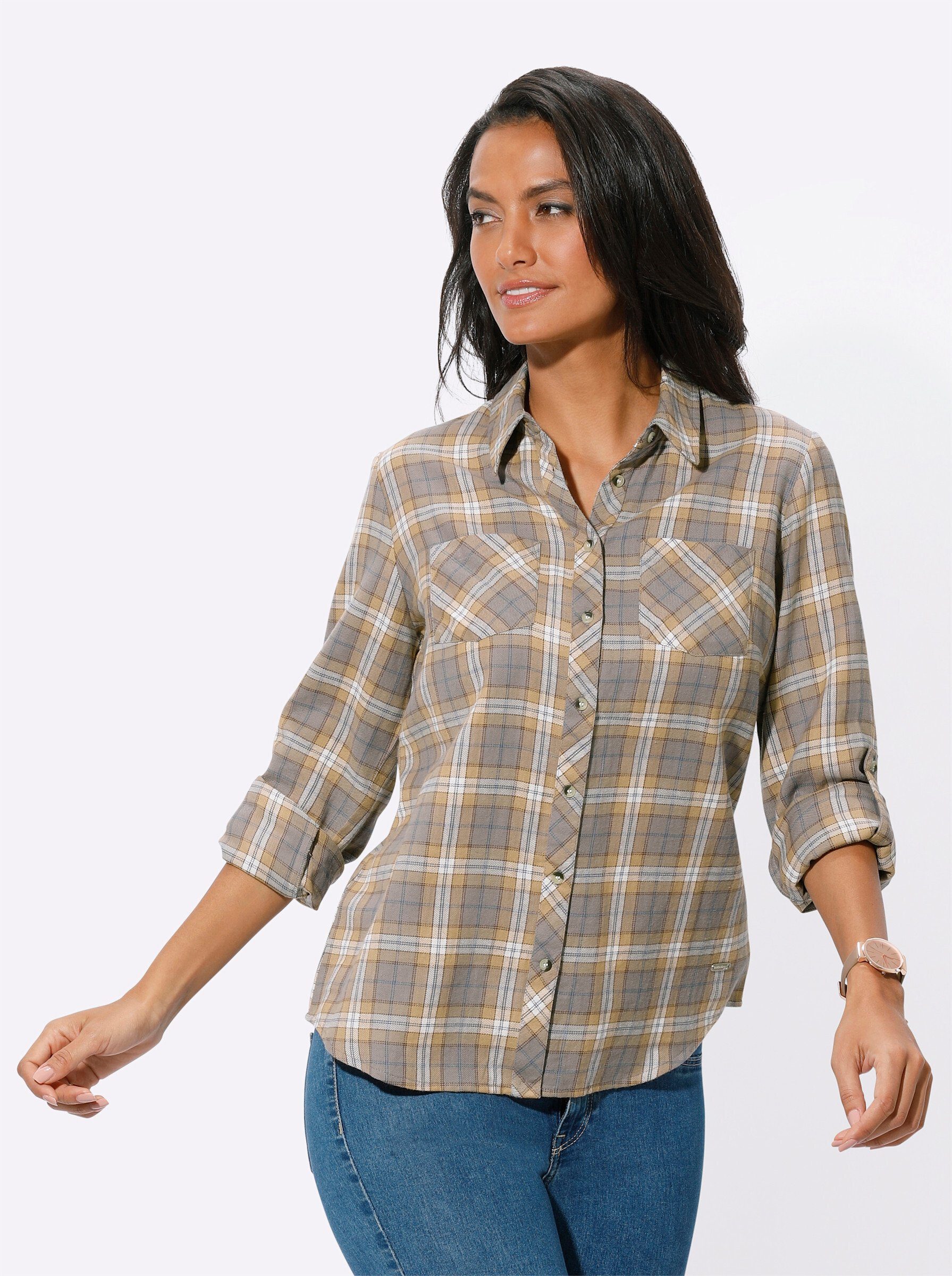 Trageangenehme Flanell-Bluse in lässigem Karo-Dessin. Mit Hemdkragen und auf 3/4-Länge krempelbaren Ärmeln mit Riegel und Knopf. Schräg eingelegte Knopfleiste mit Schmuckknöpfen in Horn-Optik. Figurgünstige Brustabnäher. 2 aufgesetzte Brusttaschen. Knopfmanschetten. Doppelt gelegter Sattel hinten mit Kellerfalte für bequeme Weite. Leicht abgerundeter Saum. Unterstützt die Initiative Cotton made in Africa.