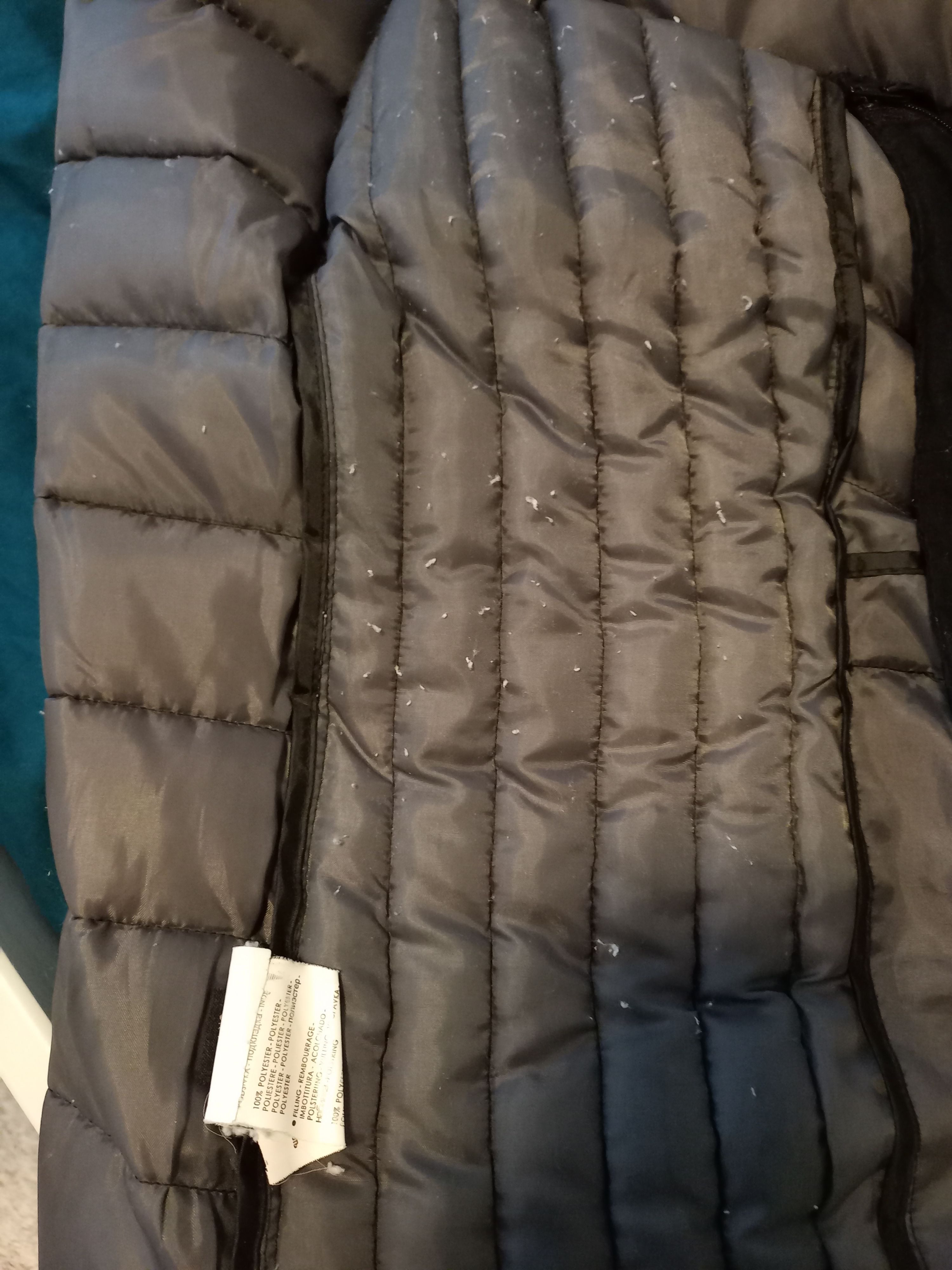 Die Fütterung der Jacke kommt von innen durch den Stoff .Kleine Kunststoff Fasern und Fussel bleiben auf der Kleidung die man unter der Jacke trägt zurück.
