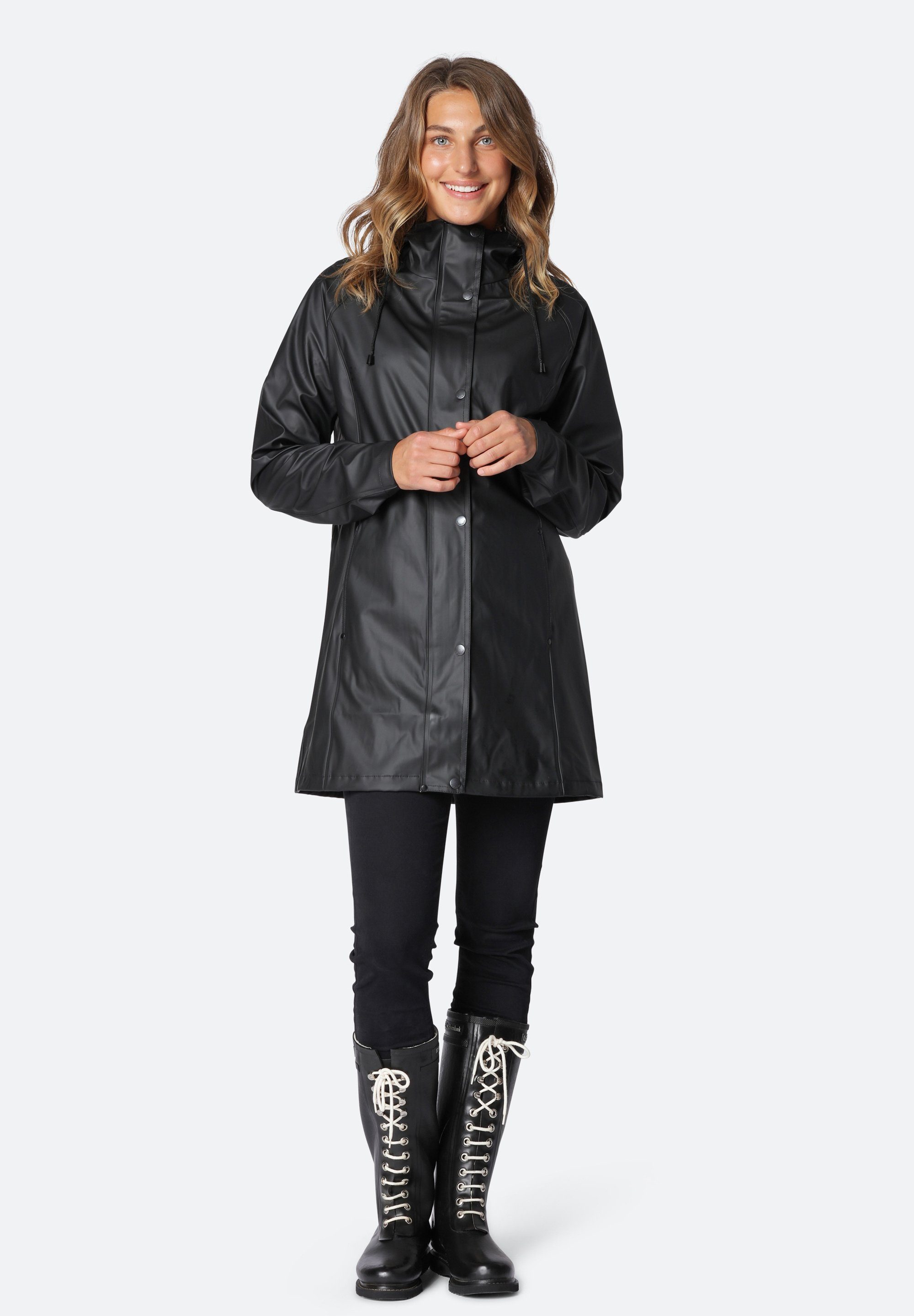 Eine leichte, feminine Regenjacke mit Oberschenkellänge. Das Modell verfügt über eine funktionelle Kapuze mit dezenter Logoprägung, seitliche Eingriffstaschen, Knopfverschluss am unteren Ärmel und einen 2-Wege-Reißverschluss. Innen ist das Modell sauber und fein verarbeitet und mit einem passenden Logoband versehen. Die Qualität ist ein leichtes und weiches wasserdichtes gummiertes PU mit Polyestertrikot auf der Rückseite und alle Nähte sind doppelt verschweißt. Das Modell ist in vielen klassischen und saisonalen Farben erhältlich.