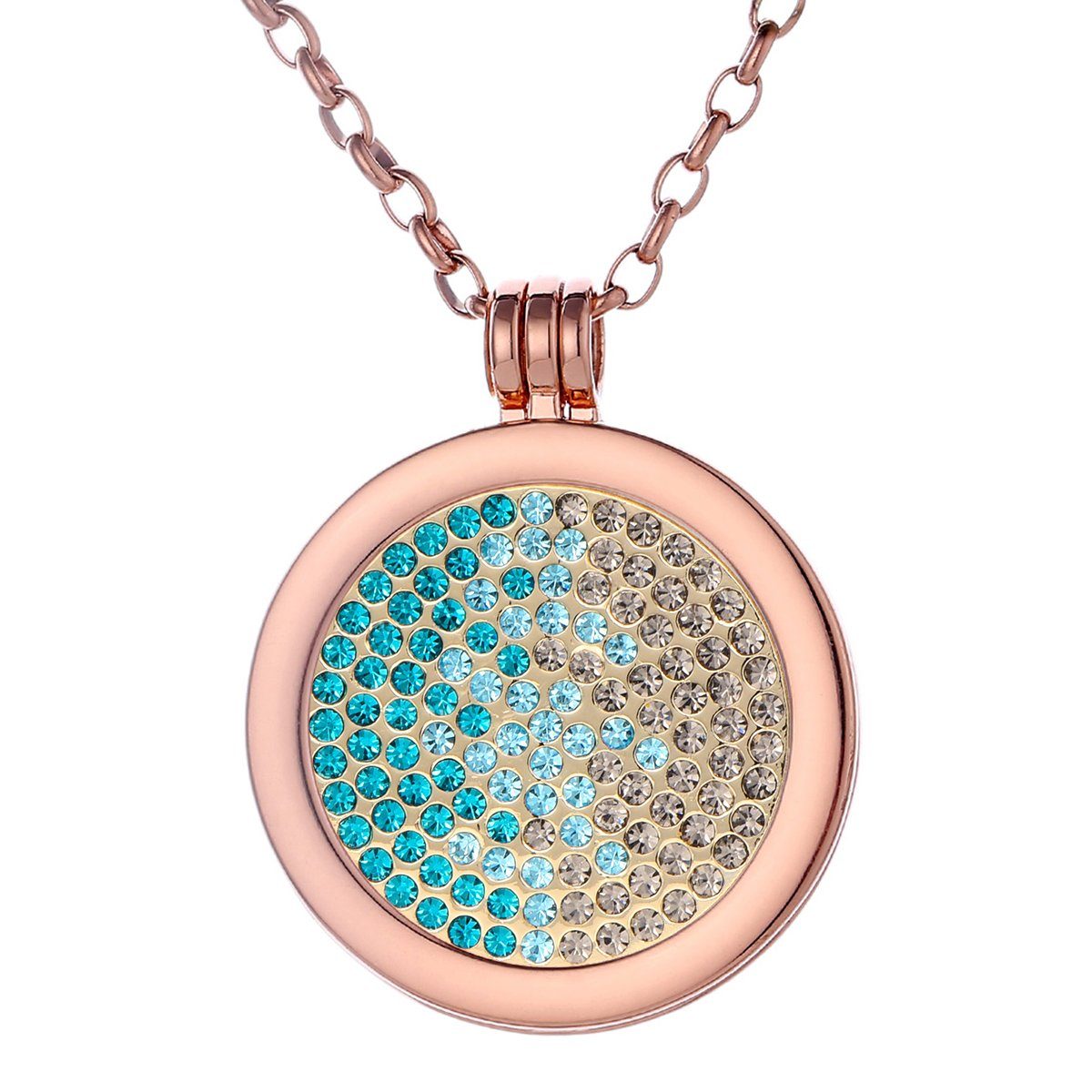 Coinketten für Damen erfreuen sich seit Jahren an wachsender Beliebtheit und sind ein wunderschönes Geschenk - nicht nur an Weihnachten. Diese wunderschöne Coin-Halskette der Marke Morella wird aus feinstem Edelstahl gefertigt, der Anhänger ist aus einer hochwertigen Metalllegierung. Die roségoldene Kette ist 70 cm lang und mit einem filigran herausgearbeiteten Coin Carrier ausgestattet. Im Inneren des Anhängers (Coin Carrier) befindet sich eine 33 mm große Coin-Scheibe. Der Anhänger lässt sich mithilfe eines kleinen Verschlusses im Handumdrehen öffnen und schließen. Dadurch können die Coins ganz einfach ausgetauscht und farblich an die Kleidung sowie persönliche Stimmung angepasst werden. Die Damenhalskette wird in einem schwarzen Samtbeutel geliefert und eignet sich dadurch auch ideal als schönes Geschenk.