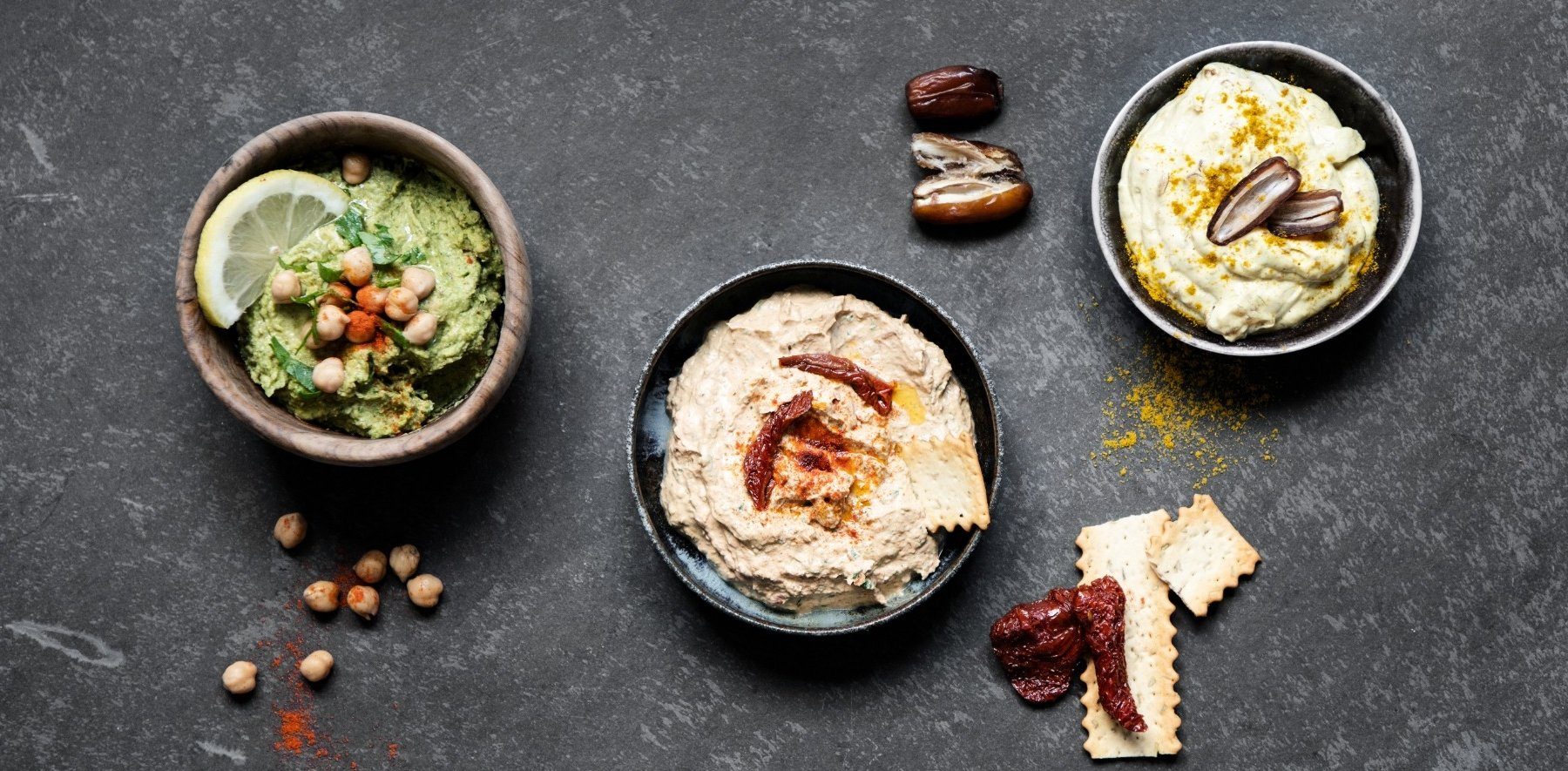 Zubereitung: Leg drei Datteln beiseite, um damit später den Dip zu dekorieren. Für die übrigen Zutaten heißt es: „Ab in den Mixer!“ Je nachdem, wie intensiv du die Curry-Komponente schmecken möchtest, gib nach und nach mehr von dem Pulver hinzu. Füll die Masse in eine Schüssel und leg die Datteln auf den Dip – denn auch das Auge isst mit!
