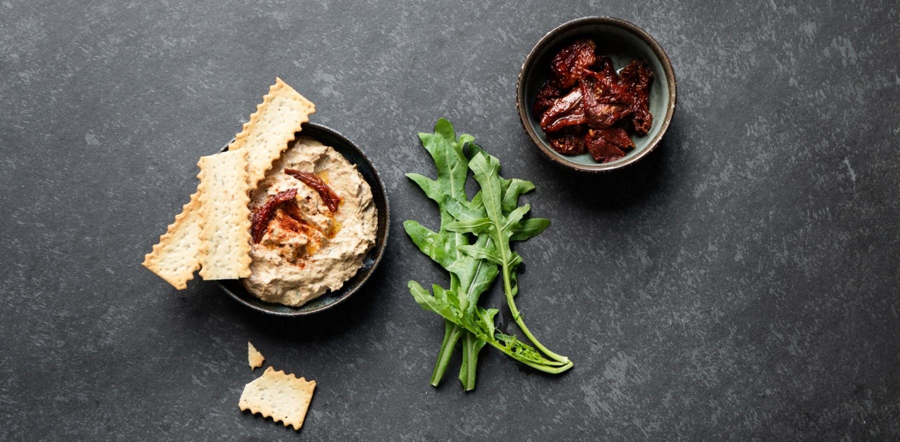 Dieses Dip-Rezept ist genau das Richtige für die ersten lauen Grillabende. Die getrockneten Tomaten geben der Creme eine mediterrane Note, während der Rucola Frische mit sich bringt. Optimal passen hier knackige Cracker oder krosse Baguettescheiben zum Dippen. Aber auch als Alternative zu fertigen Soßen oder Ketchup schmeckt der Rucola-Tomaten-Dip zum Beispiel hervorragend zu gebratener Hähnchenbrust.
