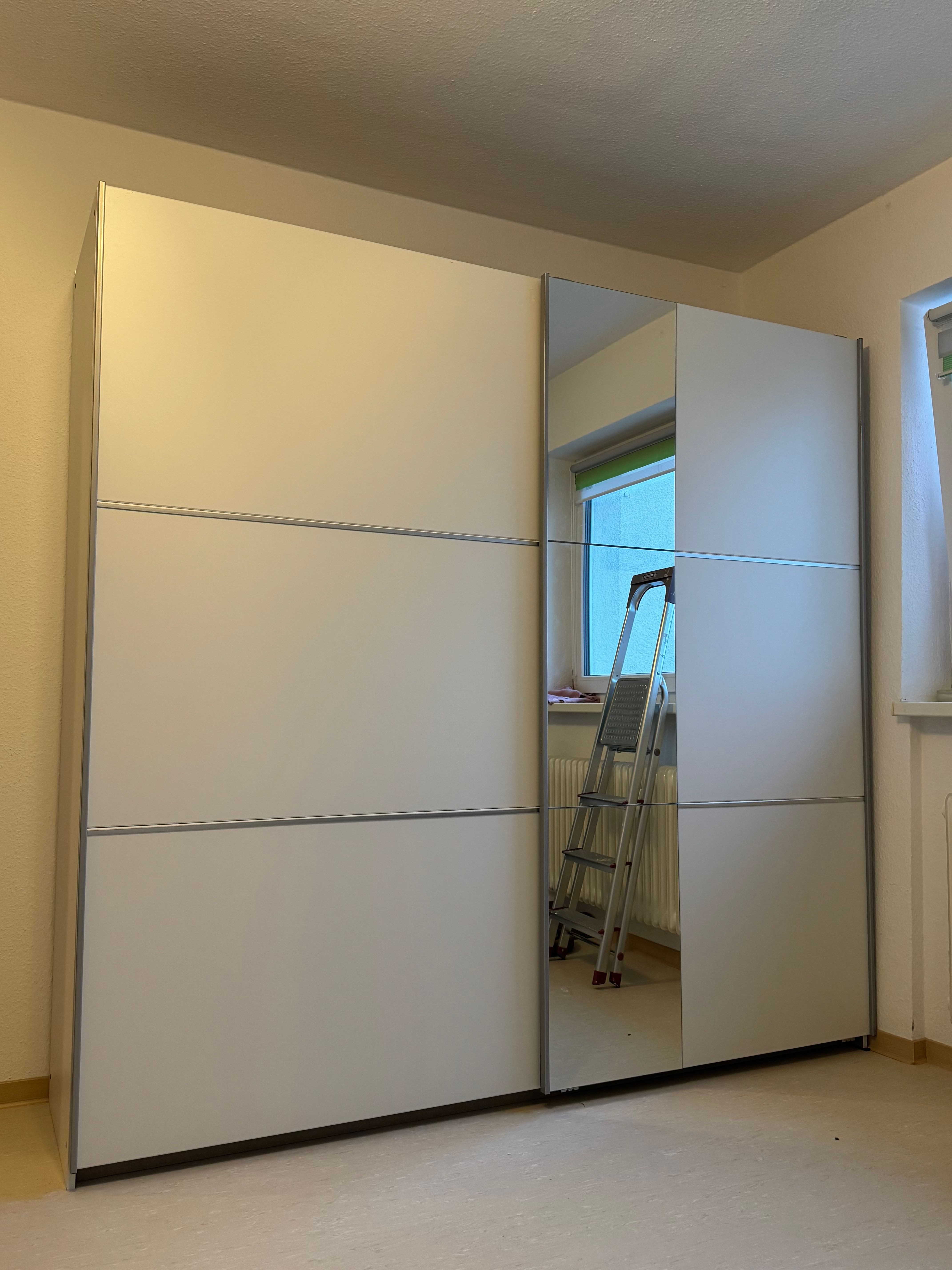Wir haben es selbst aufgebaut, die Anleitung ist unkompliziert gewesen. Jetzt steht der Schrank im Schlafzimmer und das ganze Zimmer hat schon ein besseren Eindruck. Durch die Verspieglung wirkt das kleine Schlafzimmer größer und die helle Farbe harmoniert das Ganze.