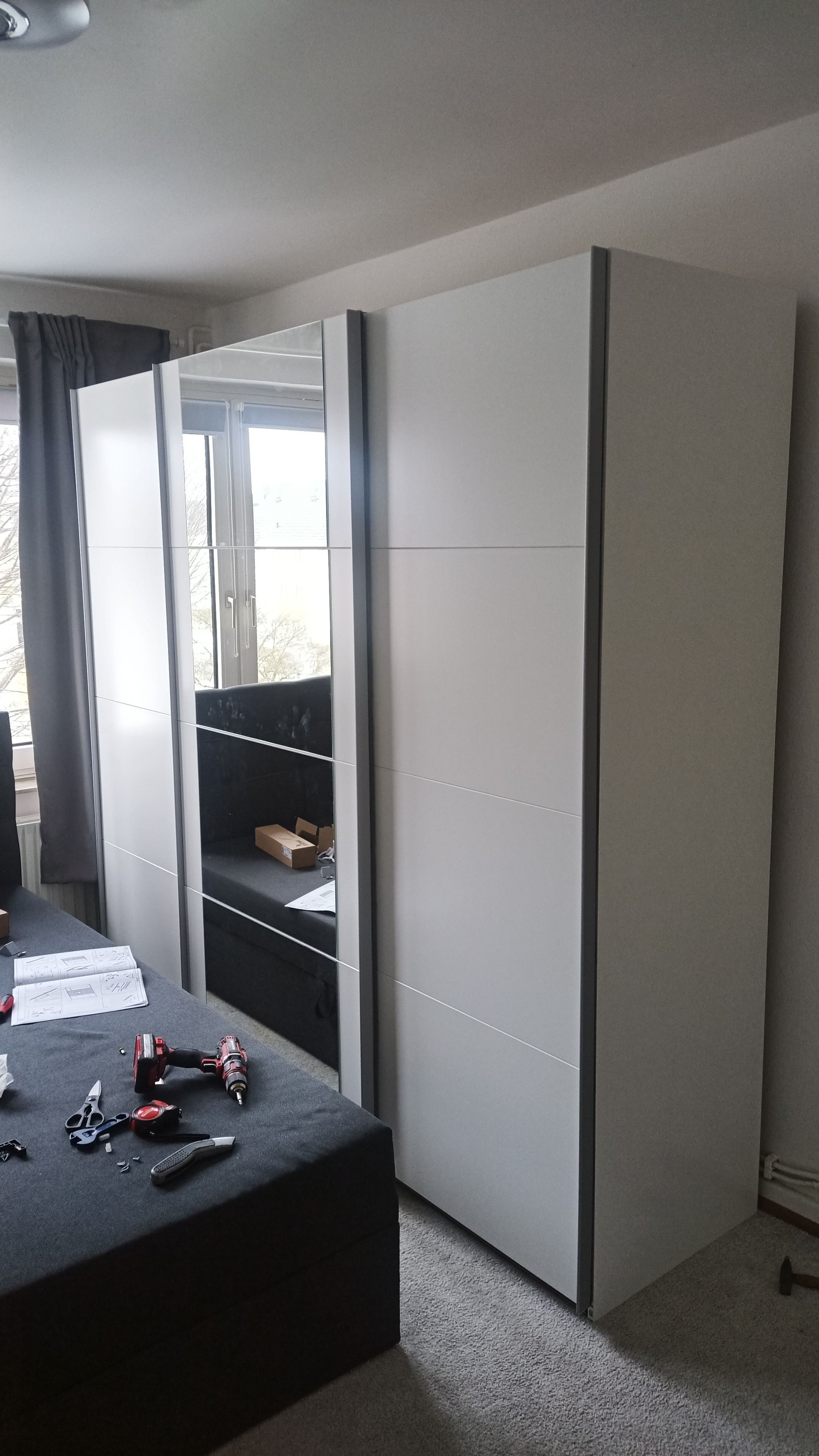 Wir haben den Schrank zu dritt aufgebaut. Die Anleitung war gut und für den ersten Aufbau eines Schwebetürenschrankes waren wir positiv überrascht und sind mit der Optik und dem Platz sehr zufrieden. Für diesen Preis vollkommen in Ordnung.