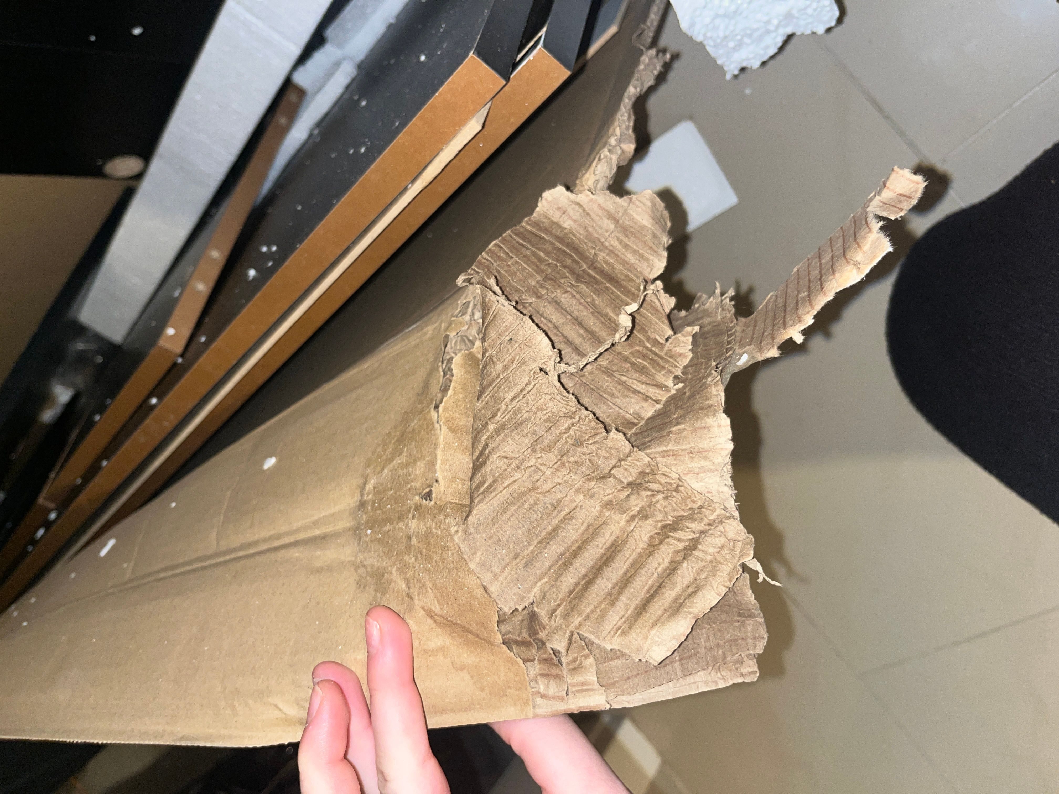 Kanten haben Beschädigungen. Da es schwarz ist, ist es direkt sichtbar. So wurde es auch geliefert. Karton war nicht beschädigt. Bin ganz unzufrieden