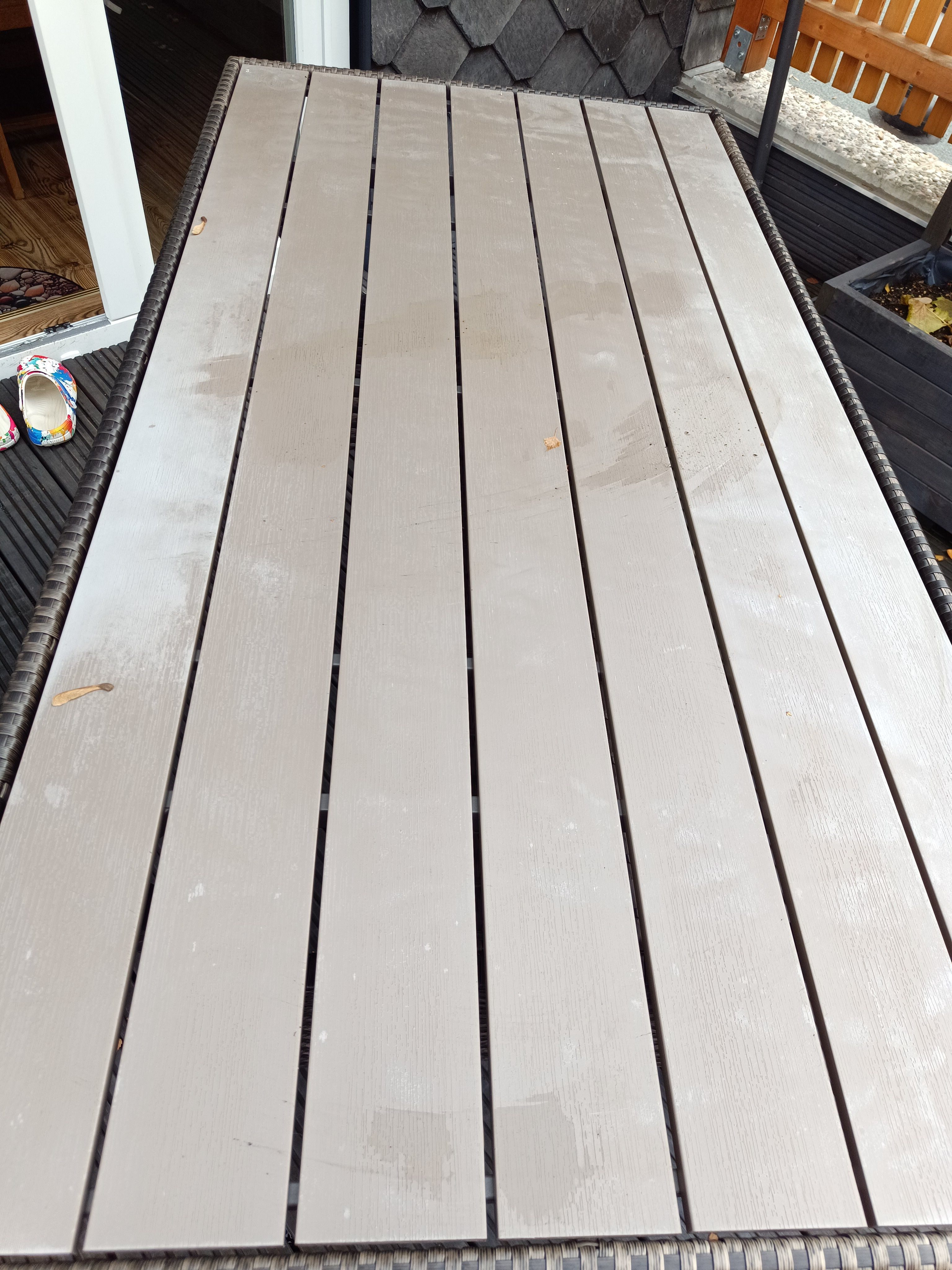 Der Tisch eignet sich nicht für Sonne und Regen, trotz Abdeckung.... hatten sogar nach Reklamation eine neuen Tischplatte erhalten.....diese sieht nur nach wenigen Wochen noch aus Gewitter aus als die erste...... wir sind enttäuscht von diesem Produkt...... haben diese neue Tischplatte erst dieses Jahr im Juli auf den Tisch montiert.....