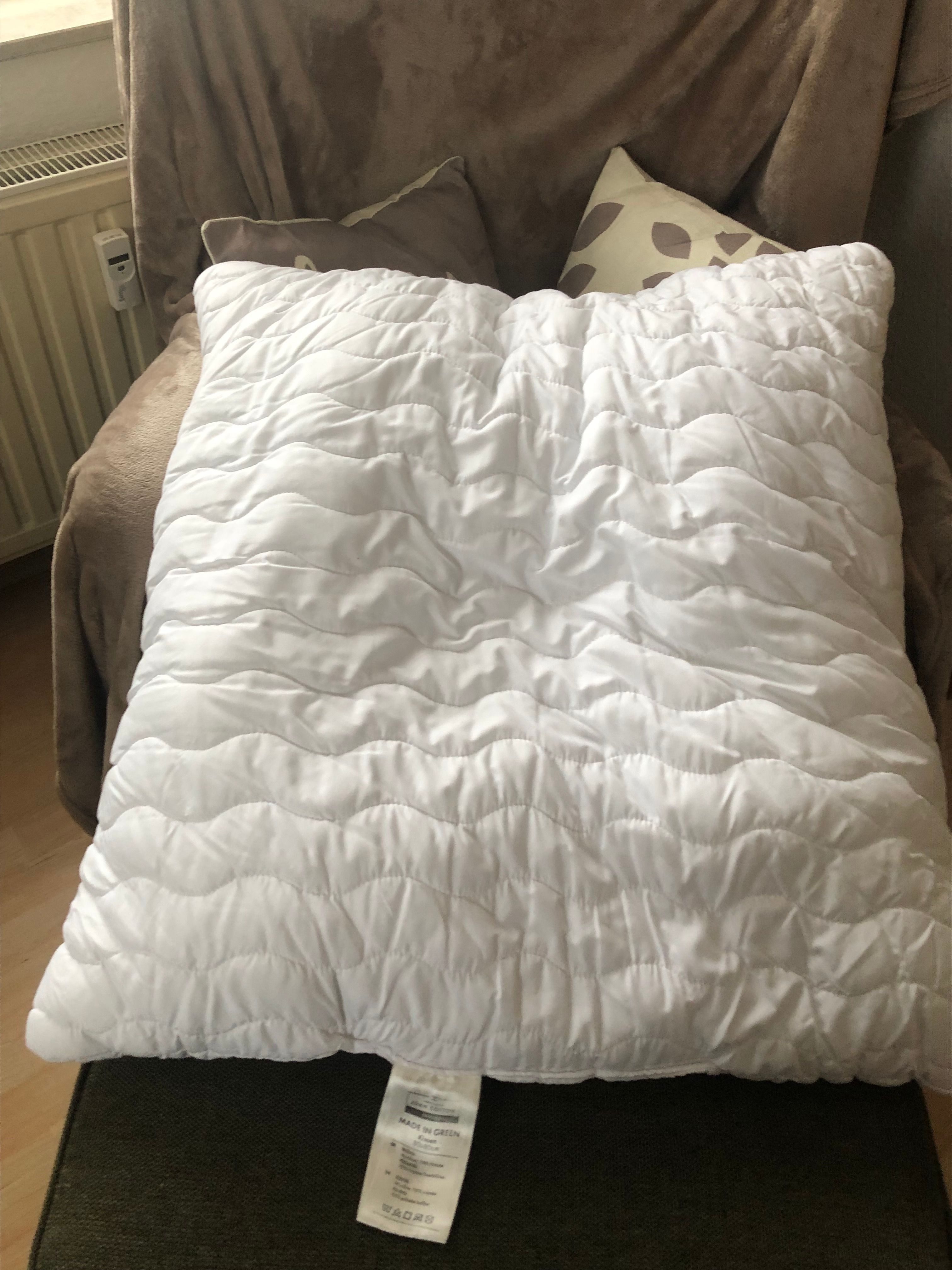 Das Kissen riecht auch gar nicht und erfüllt meine Erwartungen, die passende Decke ist genau so gut.