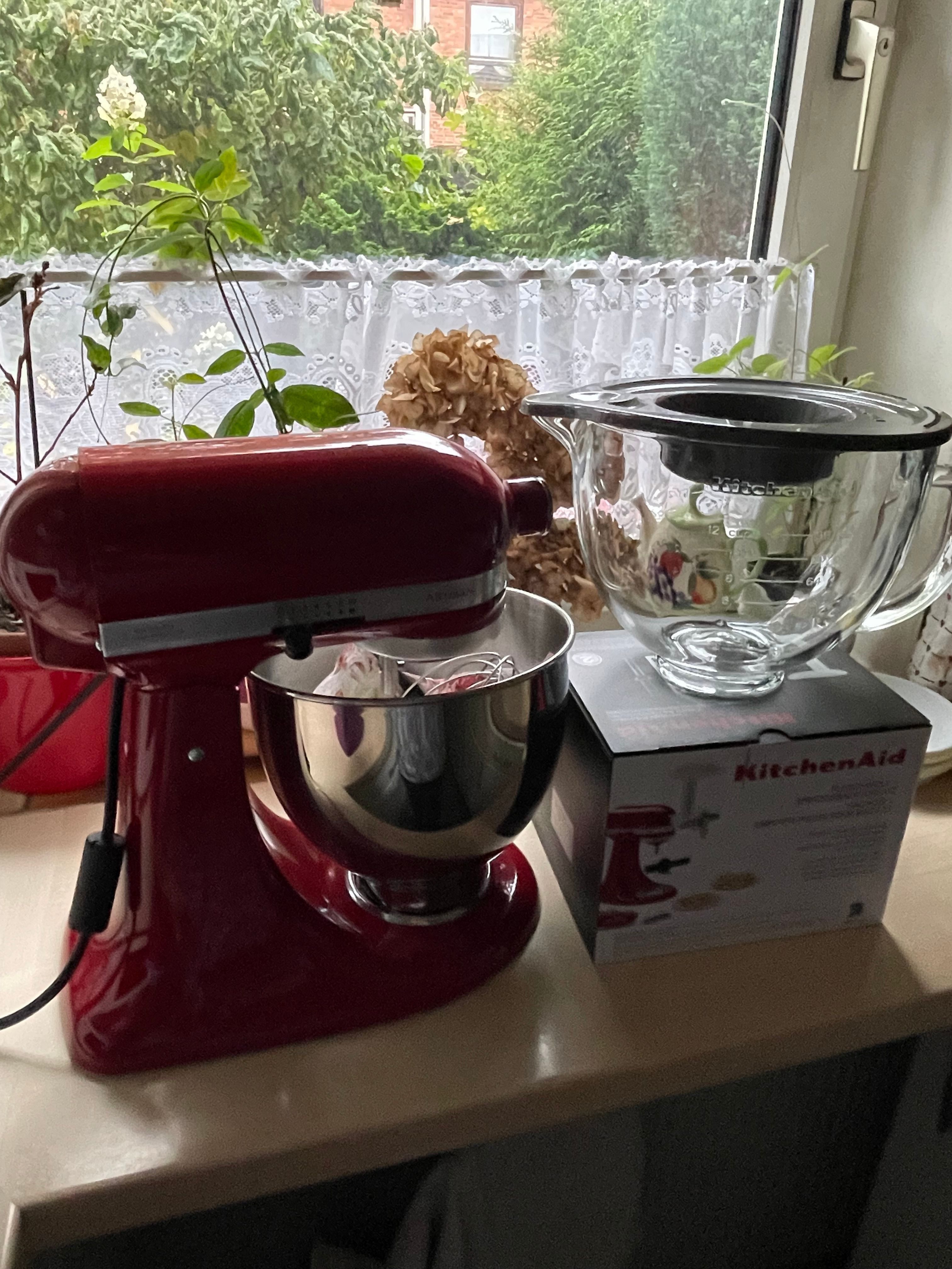 Die Artisan wirkt in Schwarz Matt recht edel und wird dann optisch auch gut zum zukünftigen TM7 passen 🙂 Das Gesamtpaket mit zusätzlicher Glasschüssel und Fleischwolf mit Spritzgebäck-Vorsatz ist für meine Zwecke einfach optimal, denn genau diese Teile hätte ich sonst für teures Geld nachgekauft, so wie ich spülmaschinenfeste Rührelementen aus Edelstahl und einen Spritzschutz dazu kaufen werde . Was sich mir jedoch weiterhin nicht erschließt ist, dass Kitchen Aid an den „Standard“-Rührelementen festhält. Die Maschine wird immer wieder gehypt, aber dann mit solchen Rührelementen als Standardausstattung versehen, die dazu auch noch eine billige Optik haben. Ein Spritzschutz gehört auch nicht zum Lieferumfang, unglaublich. Der Preis der Kitchen Aid ist primär nur durch das Design gegeben. Das kann WMF deutlich besser. Ich habe nun meine WMF Profi Plus gegen die Kitchen Aid Artisan ausgetauscht, aber allein wegen der Optik. Bei WMF müssen keine Rührelemente justiert werden, sie sind aus Edelstahl und spülmaschinenfest, der Spritzschutz gehört standardmäßig mit zum Lieferumfang und die Maschine hat einen stufenlosen und sanften Anlauf. Für wen die Optik im Hintergrund steht, der ist tatsächlich mit der WMF Profi Plus besser bedient. Aber dieses Bundle von Kitchen Aid zu diesem Preis ist top und war dann mit kaufentscheidend für diesen Spontankauf. Und dazu wieder die Turbolieferung von Otto, das war klasse 👍👍👍