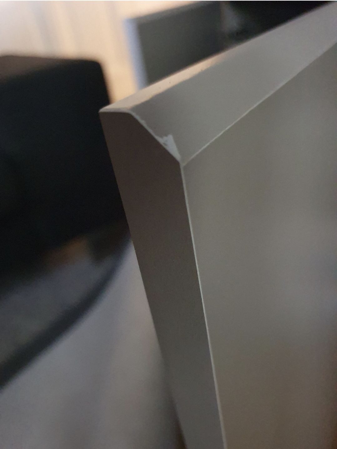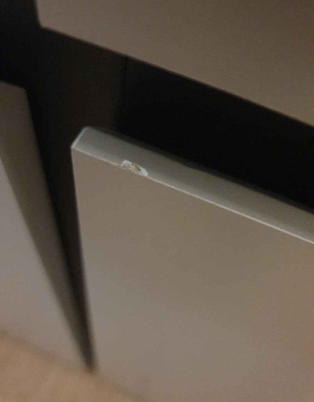 Der Schrank ist auf den ersten Blick sehr schön, die Oberflächen haptisch und optisch auch, jedoch waren an zwei Türen bereits Scharten/Einkerbungen und an einem Scharnier fehlte eine Schraube