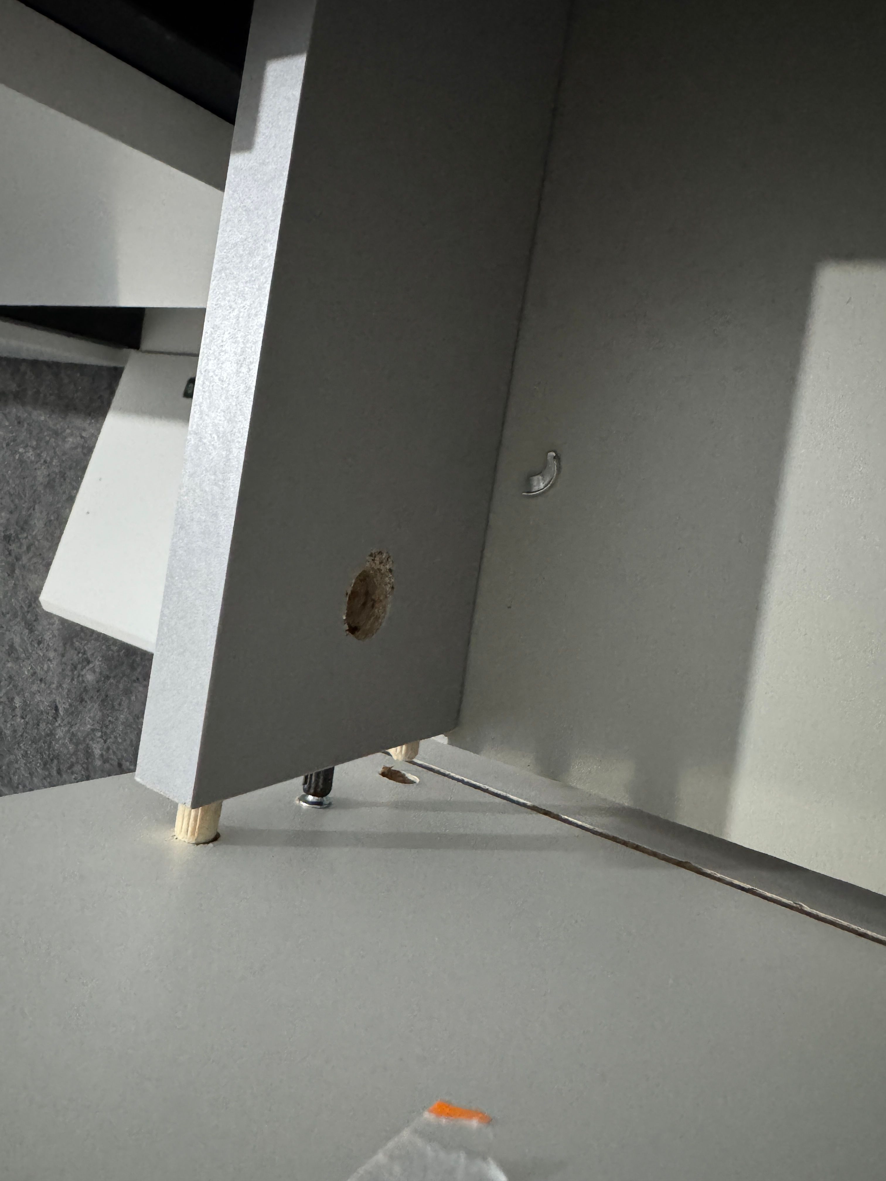 • Obere Platte/Deckplatte: Nach Montage von Unterboden und Seitenwänden passten die vorgebohrten Schraubpunkte der Deckplatte nicht zu den Schrauben/Gewindeeinsätzen in den Wänden. Die Platte musste nachgearbeitet und teilweise mit deutlichem Kraftaufwand „hineingezwungen“ werden – das ist aus Sicht der Langzeitstabilität und Materialschonung absolut unzureichend.