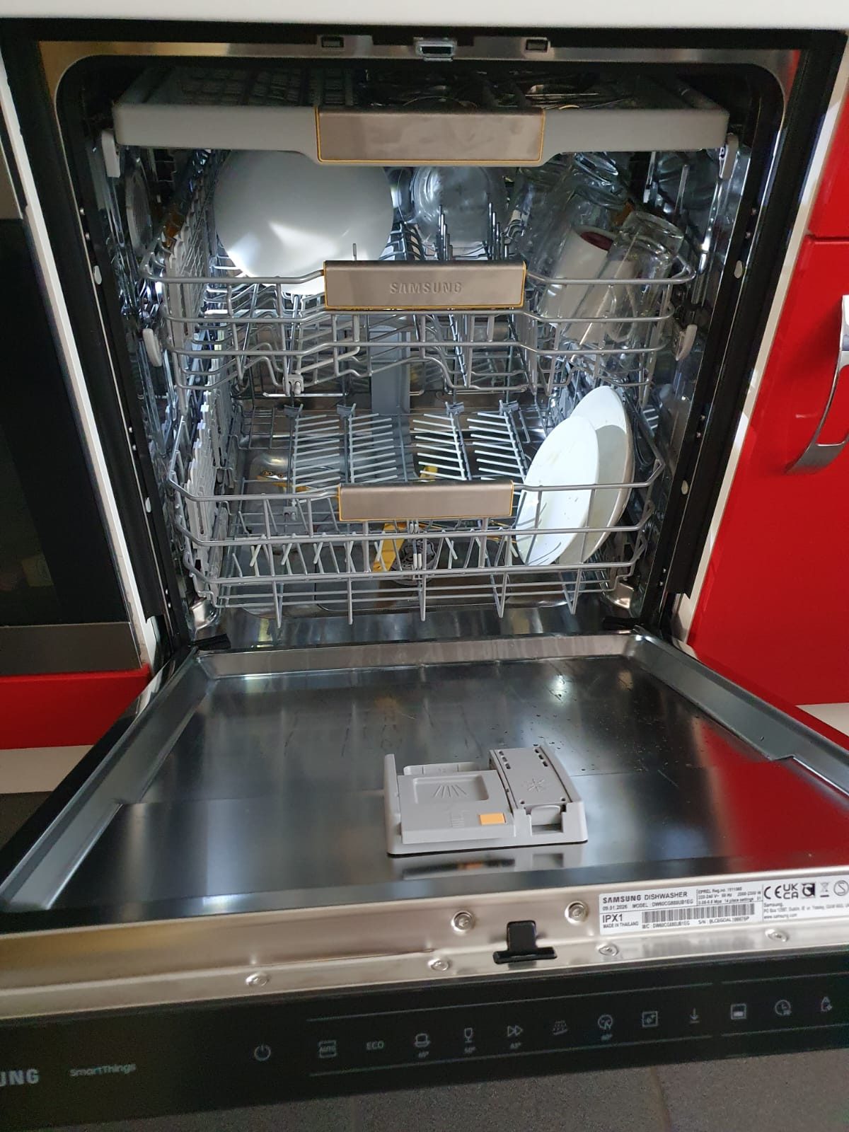 Die Spülmaschine sieht top aus, keine Knöpfe und Griffe. Sehr gute Qualität und Verarbeitung. Die Ablagen kann man individuell nach Bedarf einrichten. Das Gerät hat die Innenbeleuchtung. In Betrieb ist sie kaum zu hören. Nach dem Spülgang geht geht die Tür automatisch auf und spielt angenehmen Samsung-Ton ab, dass sie fertig ist. Die App ist leicht einzurichten. Ich finde die App-Funktion zwar unwichtig, aber wenn sie schon mal drin ist, habe die mir angeschaut und einzige sinnvolle Nutzung für mich gefunden, nähmlich Kontrolle des Stromverbrauchs. Welche Programme wieviel Strom brauchen, was dann im Monat und später im Jahr rauskommt. Ein rißen dankeschön an SAMSUNG für das tolle Gerät, das das Geld wert ist.