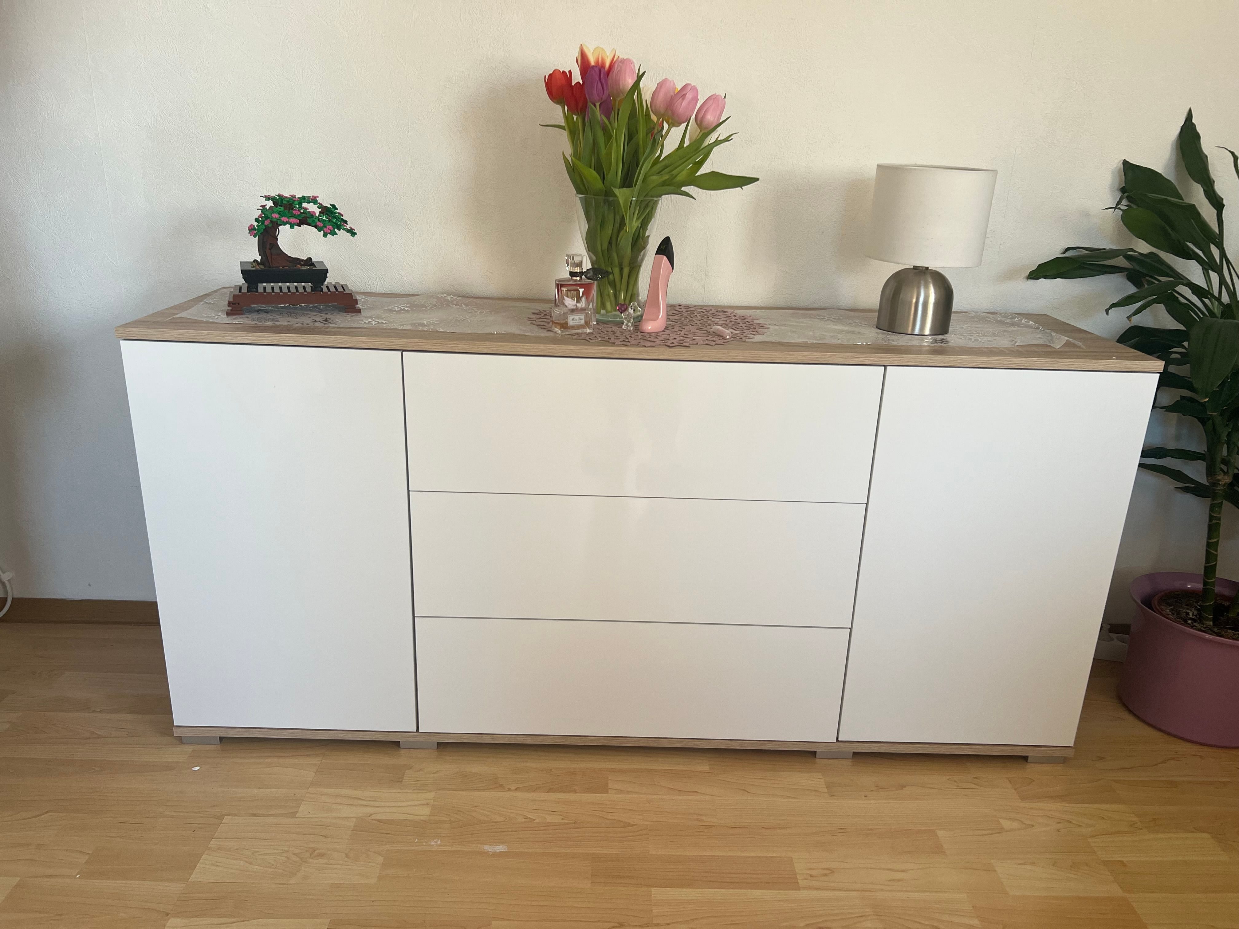 Optisch gefällt mir das Möbelstück ebenfalls. Die Fronten in Hochglanz wirken modern und edel, wodurch die Kommode ein echter Blickfang im Raum ist. Lediglich ein kleiner Wermutstropfen bleibt: ich hätte mir gewünscht, dass auch die Deckplatte in Hochglanz ausgeführt ist. So wirkt der Kontrast zwischen Front und Oberseite ein wenig nüchterner, als ich es mir vorgestellt hatte.