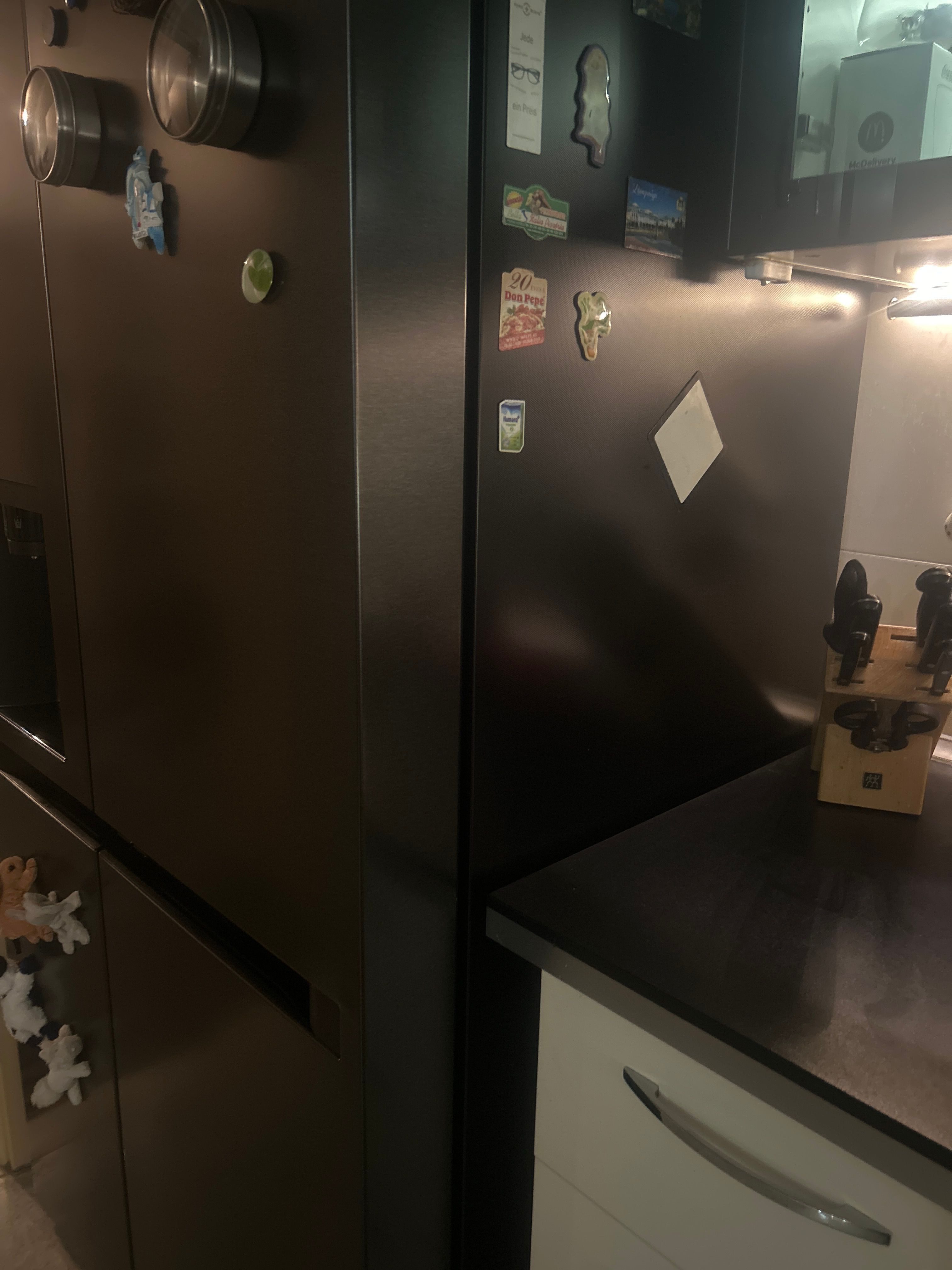 Nachdem wir den Kühlschrank das erste Mal bestellt haben, waren wir schockiert, dass die Türen in schwarz-metallic waren und nicht wie angegeben in Essence Matte Black.. also wurde der Kundendienst informiert, dass die Türen nicht schwarz matt sind, wie erwartet. Daraufhin wurde uns ein neuer Kühlschrank zugesendet. In der Zwischenzeit wurde die Farbbezeichnung von der Produktbeschreibung auf schwarzmatt- metallic geändert. Beim zweiten Kühlschrank bestand dann das gleiche Problem. Also hab ich den Kundendienst angerufen und das Problem erklärt. Dabei wurde mir nur mitgeteilt, dass ich die Beschreibung richtig lesen soll und dort schwarzmatt-metallic steht.. das steht aber auch erst jetzt nach der Korrektur dar.