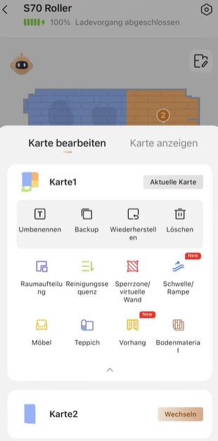 Beim ersten Einsatz erstellt der Roboter mithilfe der Navigation eine genaue Karte der Wohnung. Diese kann man dann bearbeiten, indem man Räume benennt und die Reinigungs- oder Reinigungsintervalle für einzelne Räume festlegt.