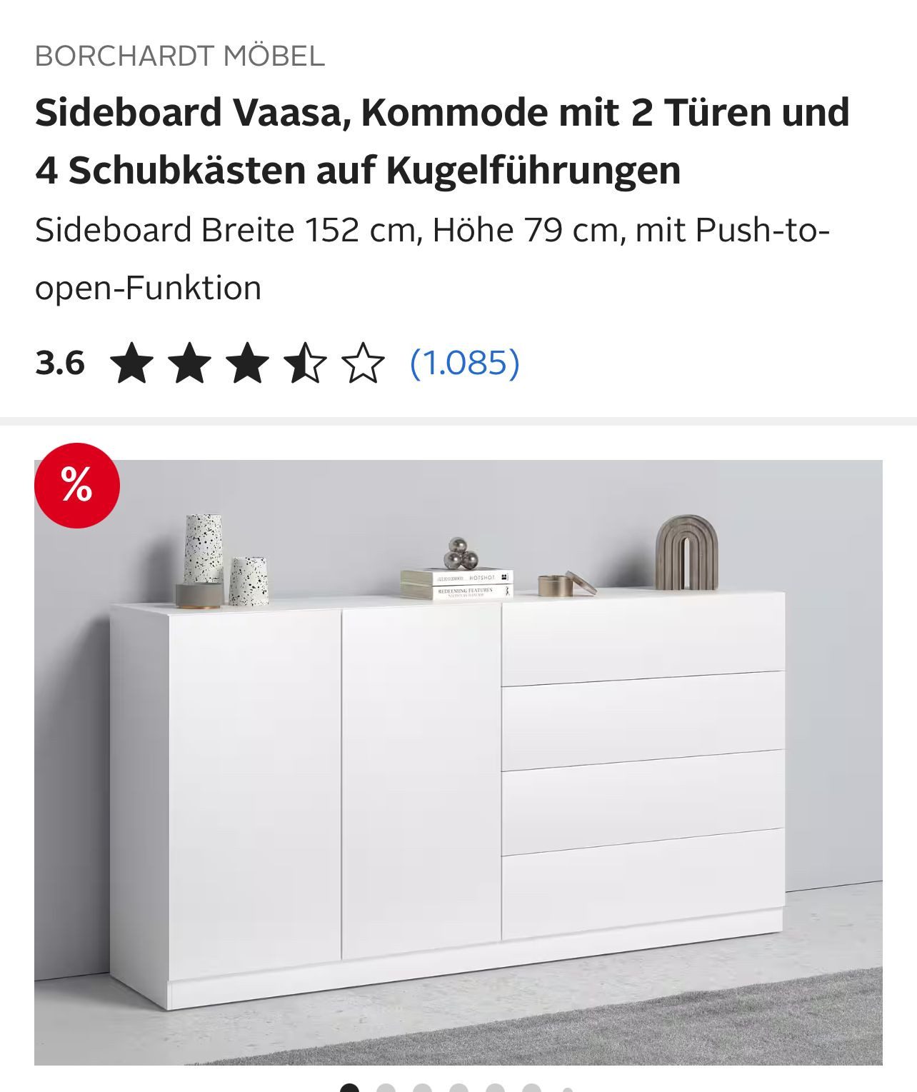 Ich bin sehr enttäuscht, da das Preis-Leistungsverhältnis in keiner Weise zutrifft. Die Kommode ist nicht nur billig verarbeitet, sondern sieht auch noch billig aus. Schubladen sind klapprig und sitzen nicht richtig, das Gleiche trifft auf die Türen zu. Mit der Push to opem Funktion gibt es keine Probleme. Hochglanz sieht auch anders aus. Die Kommode ließ sich auch recht einfach aufbauen. Dennoch mein Fazit; wäre sie nicht aufgebaut, dann hätte man sie wieder abholen können. Schade ums Geld.