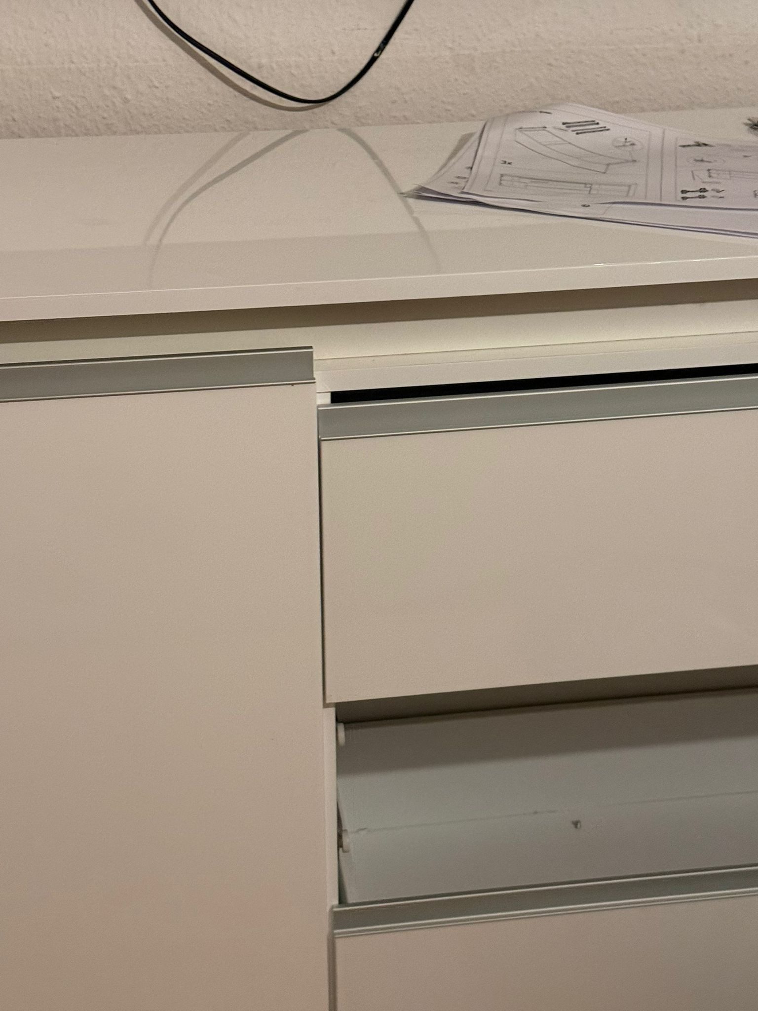 nach dem Zusammenbau festgestellt das an den Kanten der Schubkästen Kratzer, richtige Schürfspuren dran sind. Beim zusammenbau der Schubkästen, platzt das Hochglanzfurnier ohne Gewlteinwirkung... Ich bin fassungslos. Diese Kommode ,das Furnier ist auf keinen Fall zu empfehlen. Steht in meinem Esszimmer und ich weiß nicht wie ich reagieren soll... am liebsten abholen lassen...
