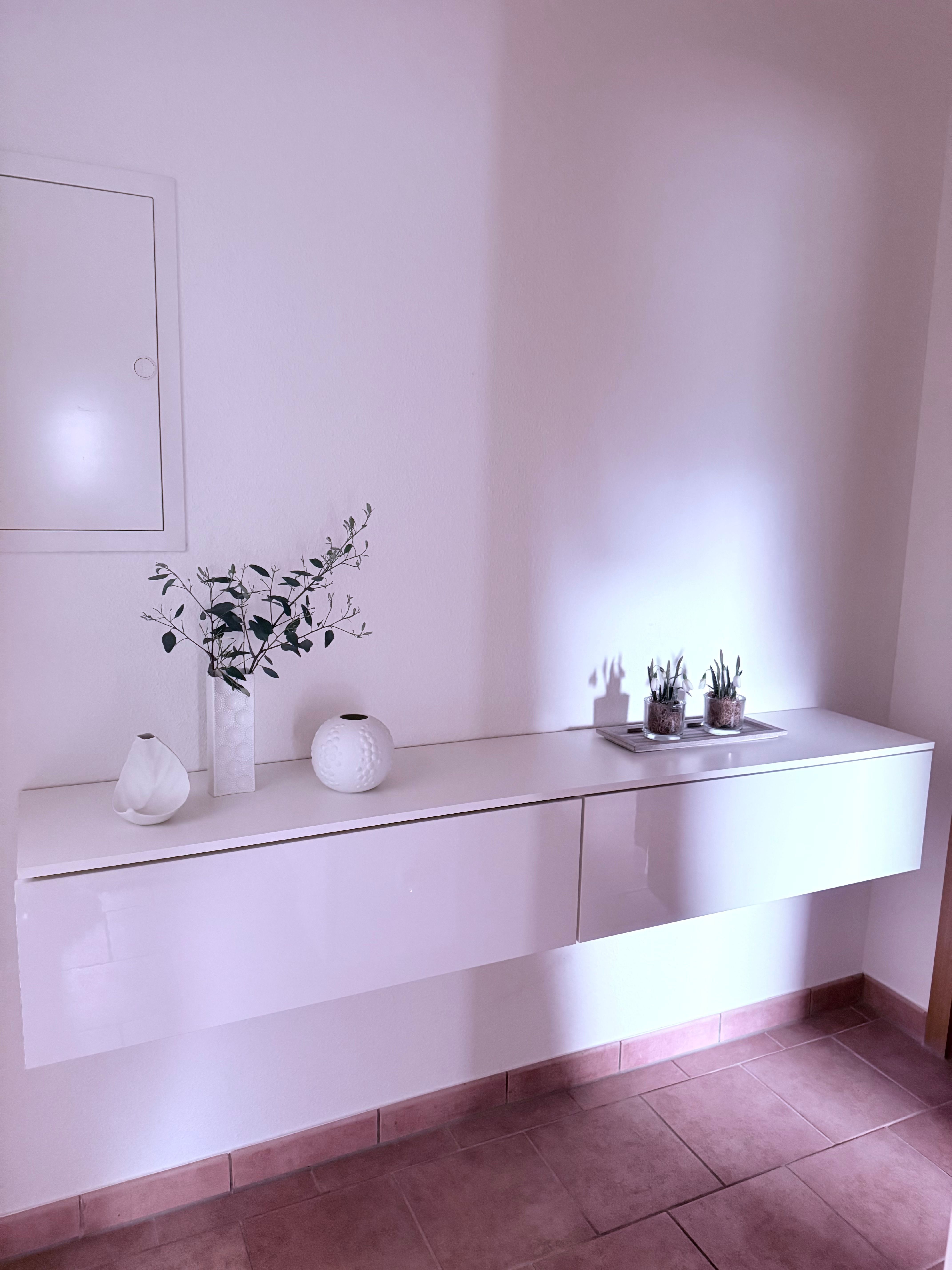 Ich habe nach so etwas gesucht für meinen kleinen Flur. Später kommt noch ein großer rahmenloser rechteckiger Spiegel darüber.