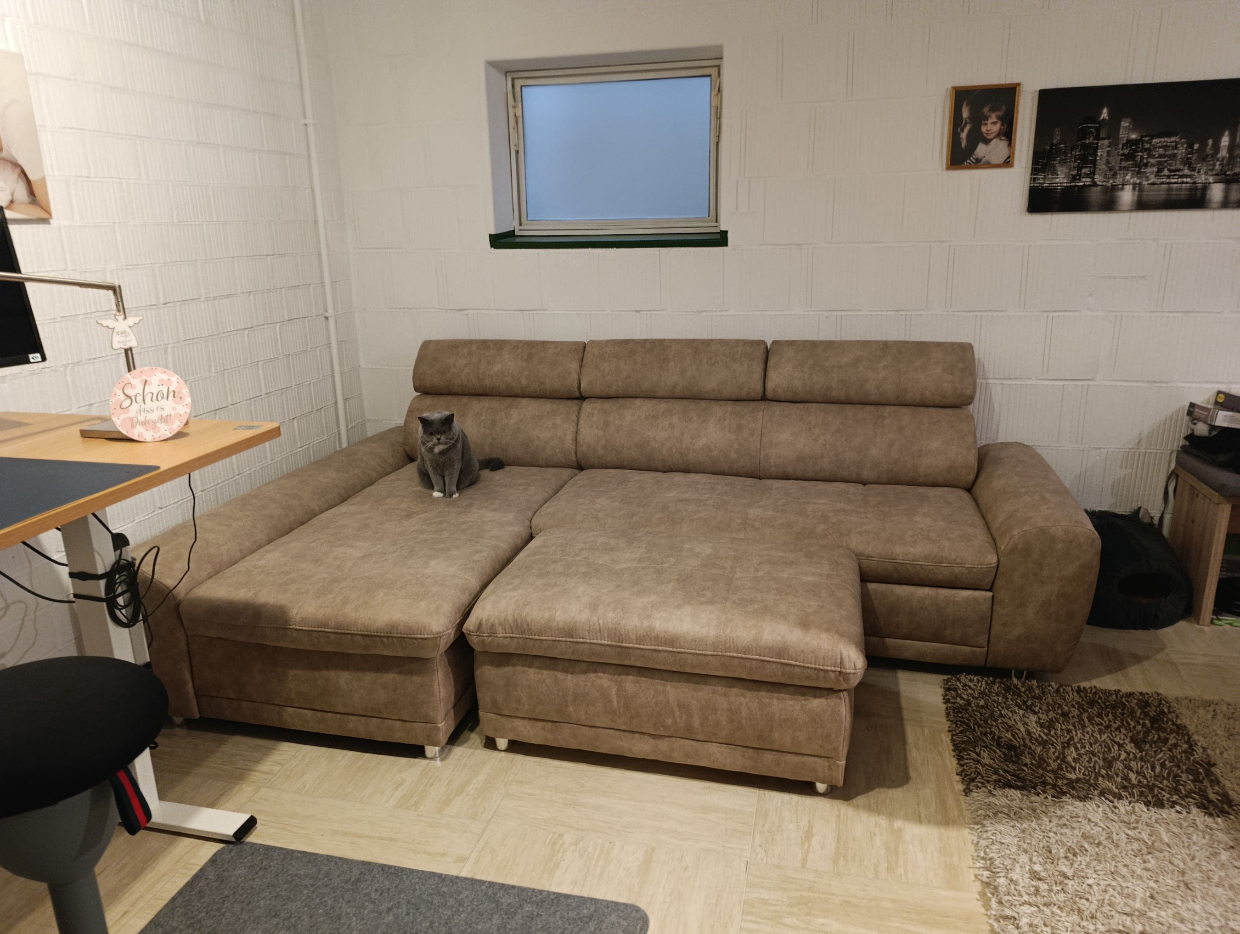 Tolle Couch, auf der man den Feierabend genießen kann. Durch den Bettkasten ist die Sitzfläche zwar nicht ganzso tief, wie bei welchen ohne Schlaffunktion. Trotz alledem gemütlich. Die Kopfteile lassen sich einfach verstellen.