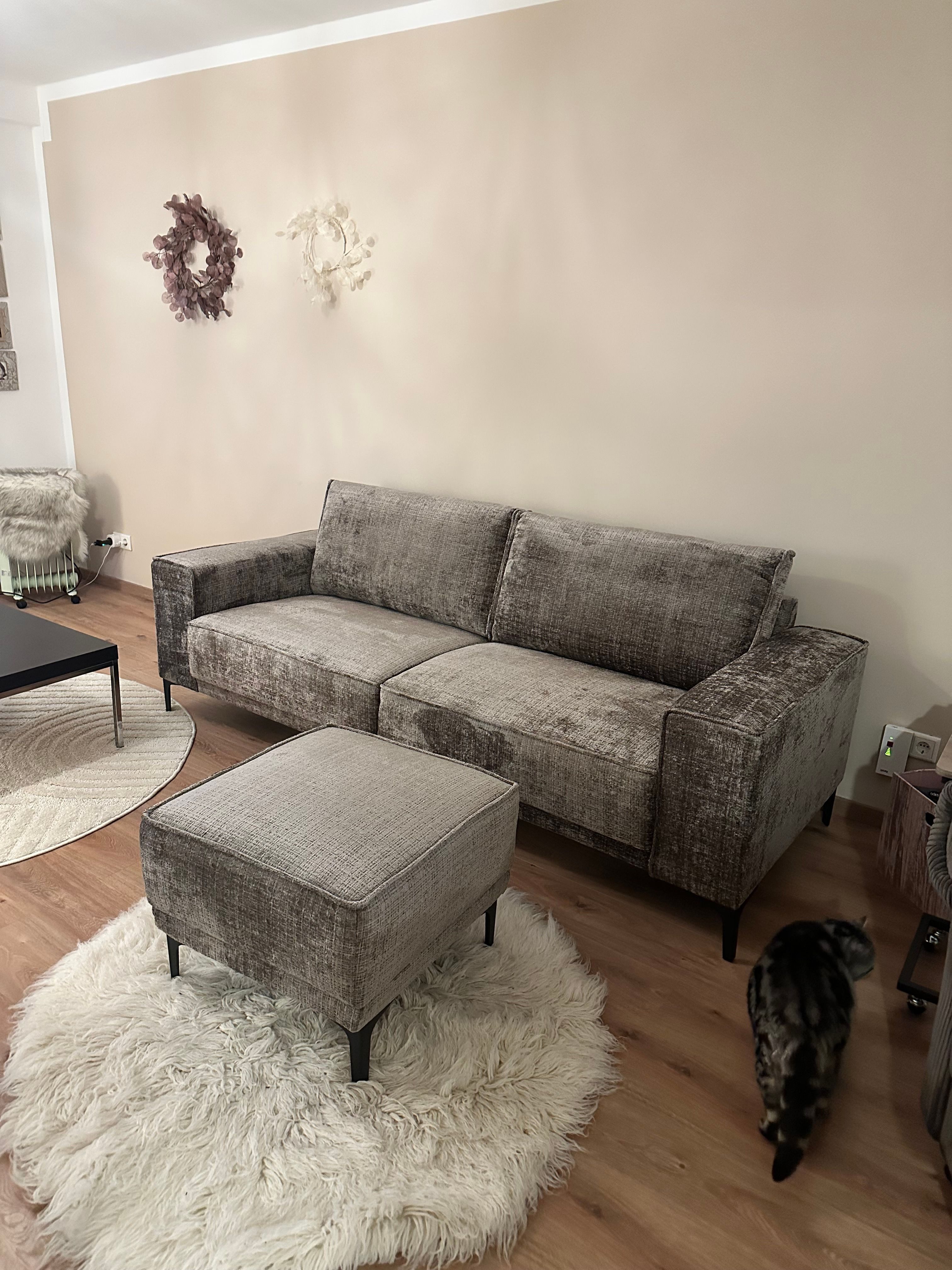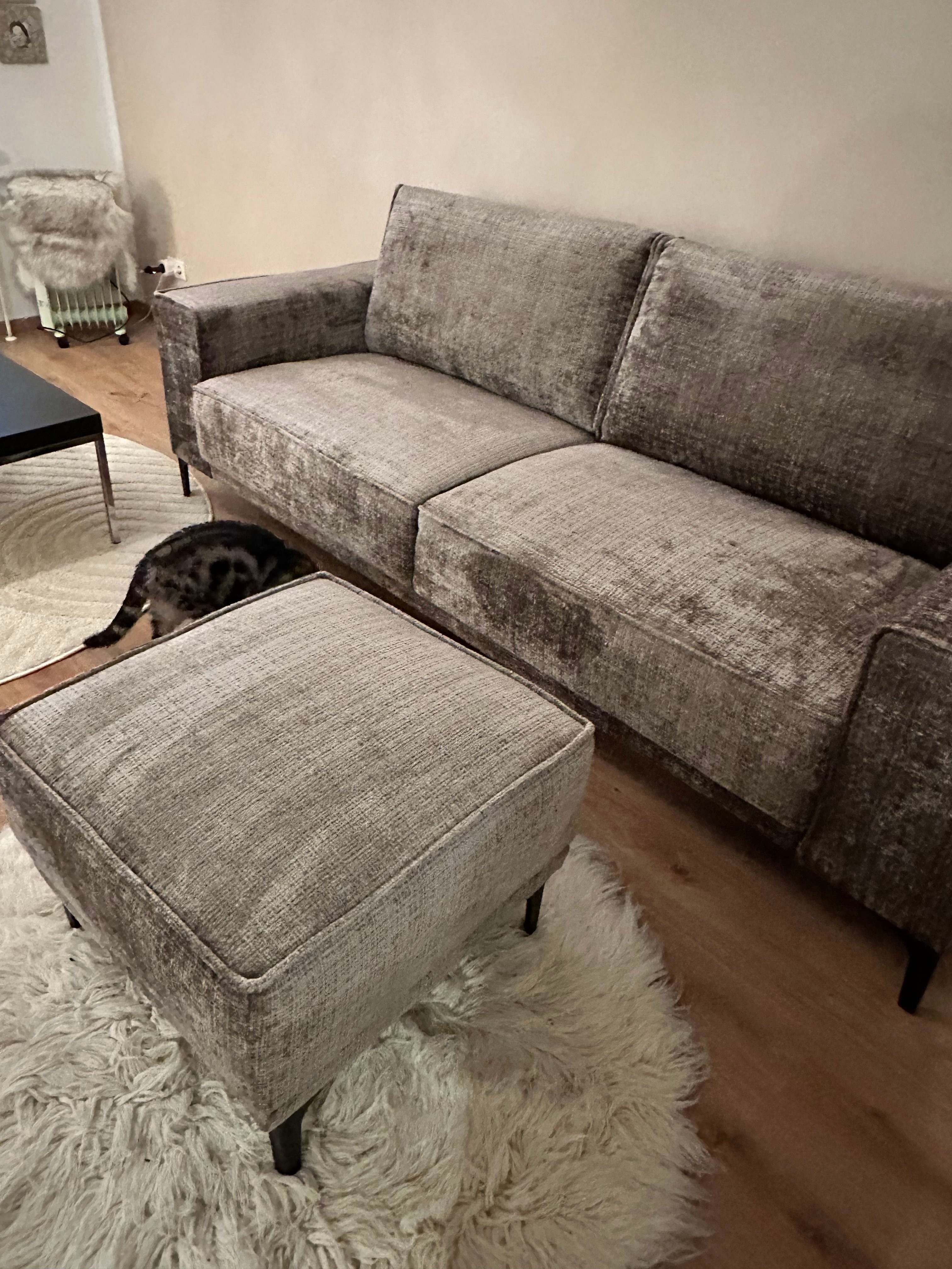 Nach langer Wartezeit ist sie endlich da und ich finde sie noch schöner als auf den Bildern. Sehr bequem. Wie kann ein Sofa nur so schön sein. Der Hocker passt perfekt dazu.