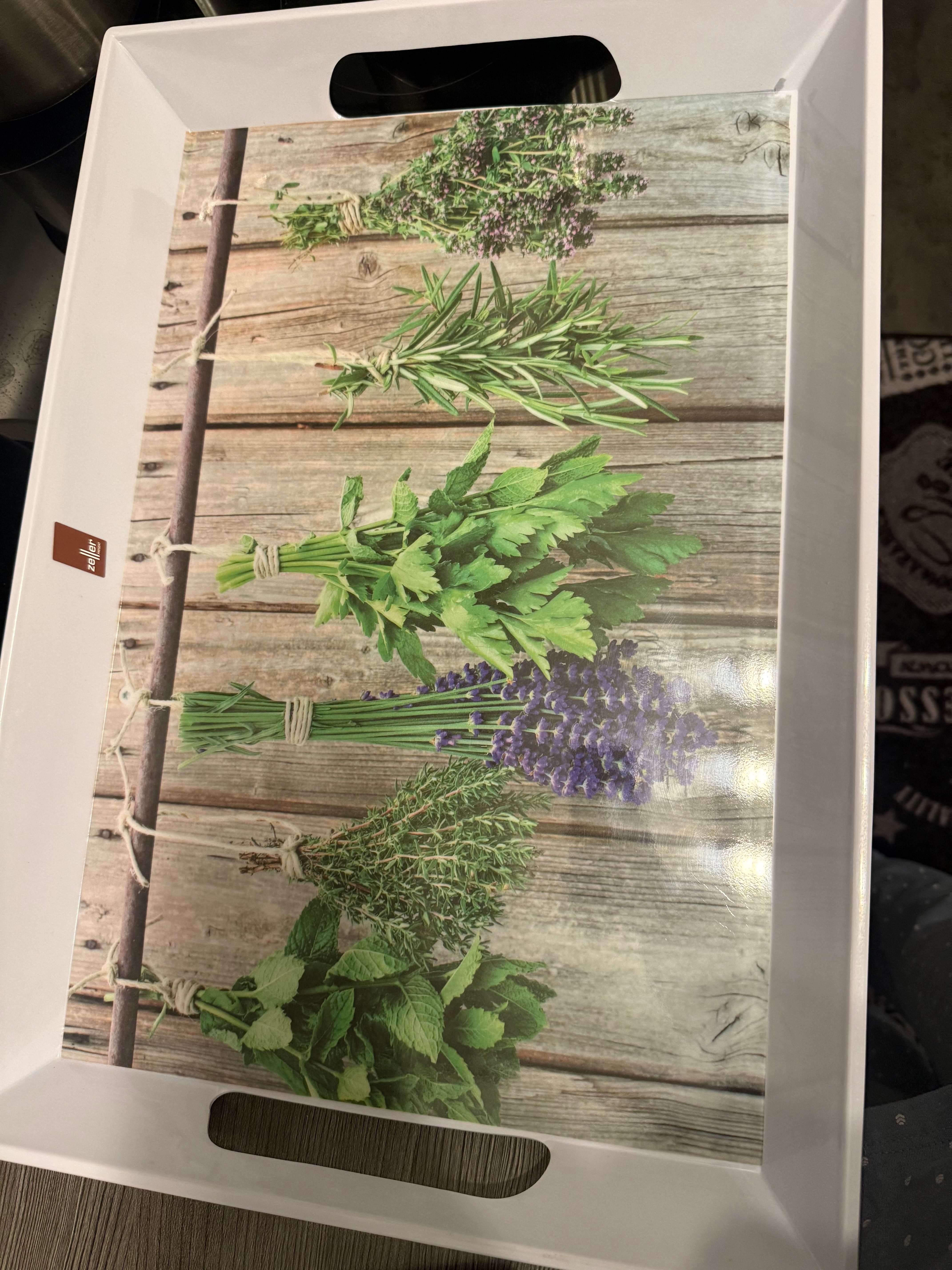 diese Tablett passt sich optisch in meine Küche ein, weil ich meine Dekoartikel auf Kräuter abgestimmt habe,