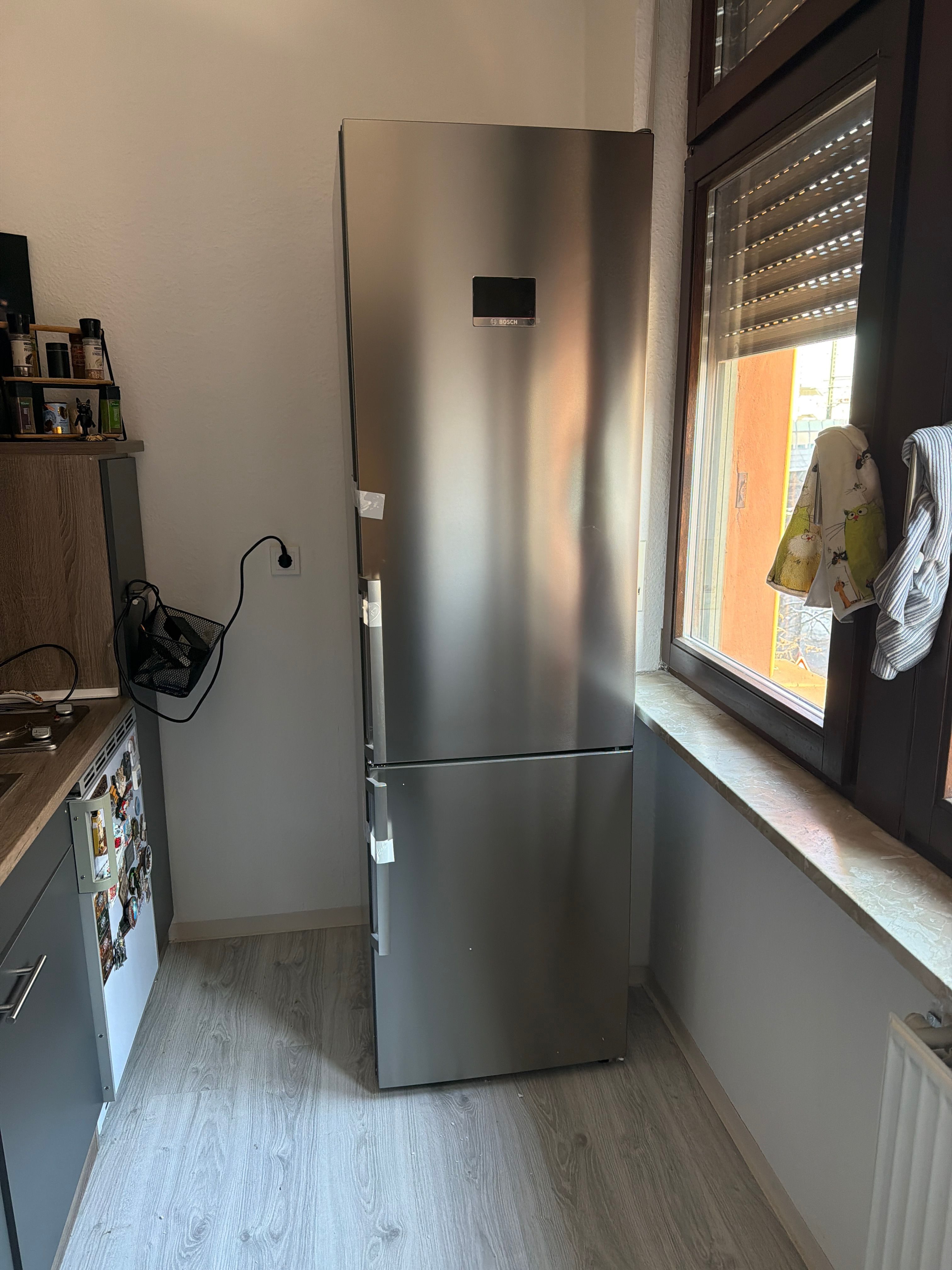 Nun kann ich nach einige Wochen die Bewertung abgeben. Es ist mein erster No - Frost Kühl-/Gefrierkombination von Bosch. Ich bin sehr zufrieden , es kühlt leise, sehr geräumig und hat viel Platz. Hochwertig bearbeitet. Hermes Spedition , sehr zufrieden, bis zur Küche gebracht und ausgepackt. Verpackung wurde mitgenommen.