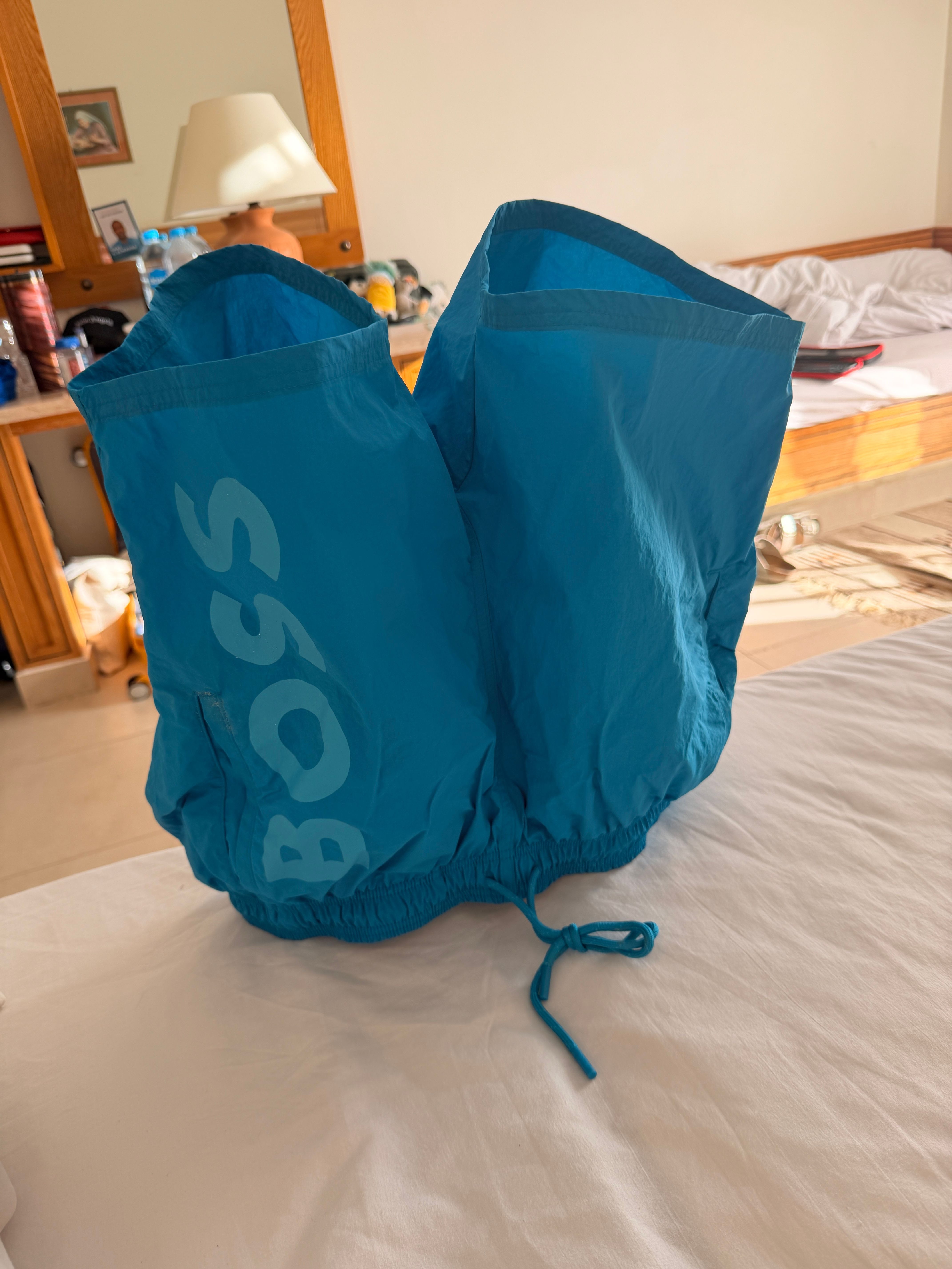 Wenn die Shorts in der Sonne trocknet, hart und steiff wie eln Brett - siehe Fotos!!! Habe 2 weitere in rot und orange, die eine von Hugo Boss , die andere von än Hugo. Beide gewohnte Qualität. Überlge echt, ob ich Sie nach dem Urlaub zurücksende... Schade!