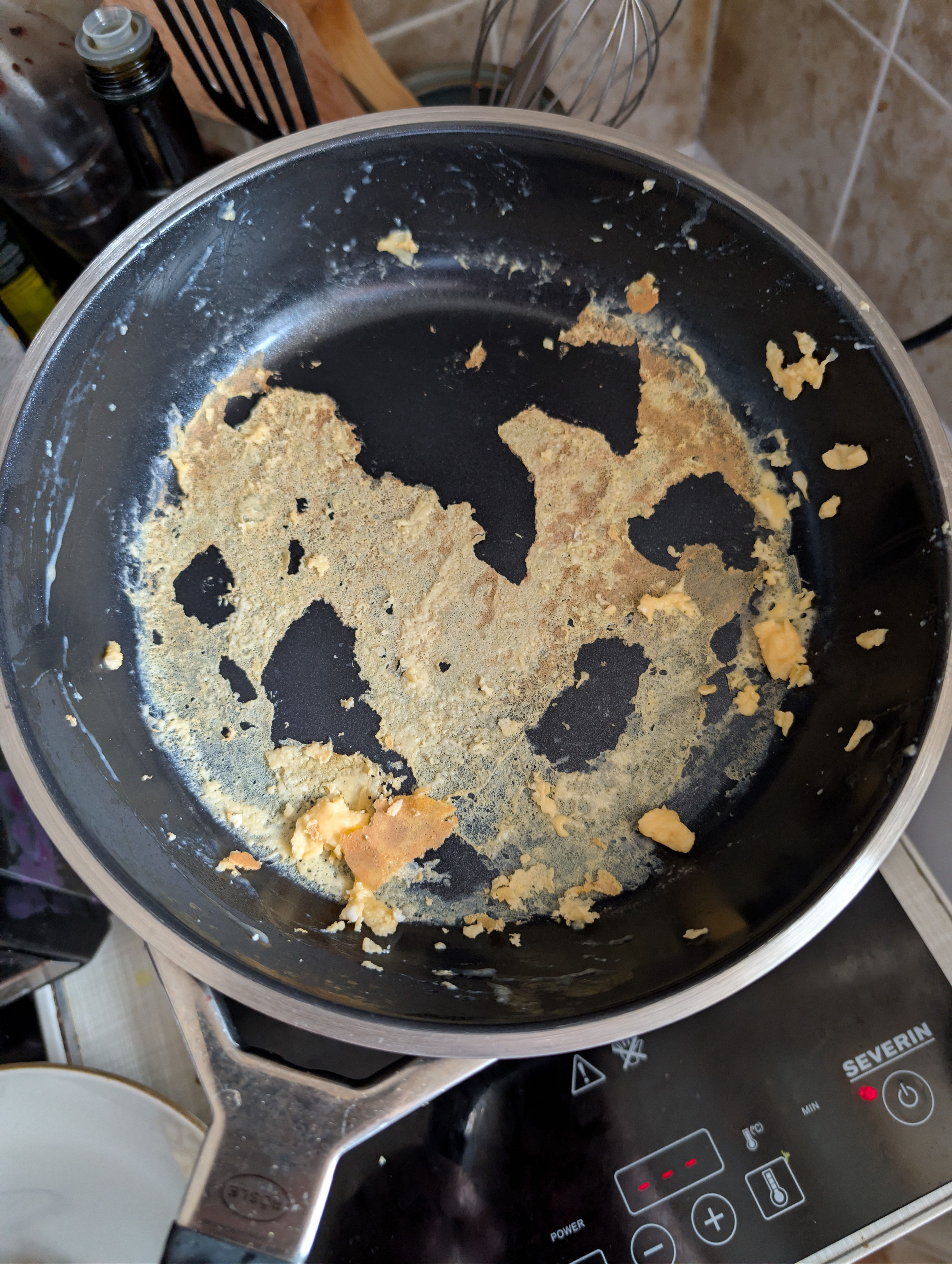 Nach nur fünf Benutzungen sieht die Pfanne nach dem Zubereiten eines Omeletts leider schon so aus wie auf dem Bild. Dabei bin ich extrem vorsichtig mit ihr umgegangen: Ich habe ausschließlich Silikon-Küchenhelfer verwendet und die Pfanne nur mit einem weichen Schwamm gereinigt. Angesichts der kurzen Nutzungsdauer entspricht die Qualität nicht meinen Erwartungen.