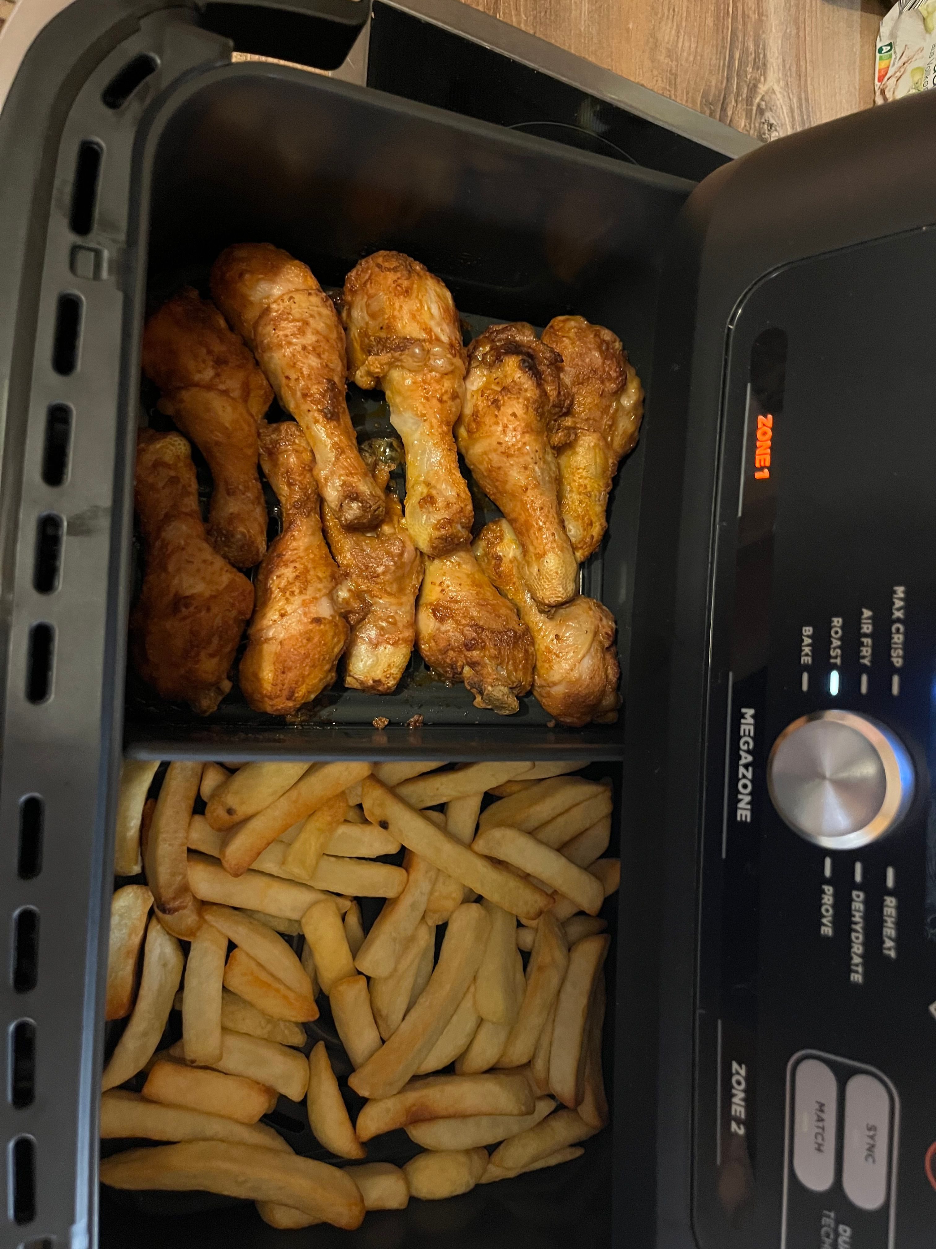 Mit einem tollen Fassungsvermögen, aber mit 2 Kammern die man getrennt bedienen kann. Es gelingen Pommes sehr viel besser, Kroketten, Chicken Nuggets, Frikadellen, Muffins und co bestens