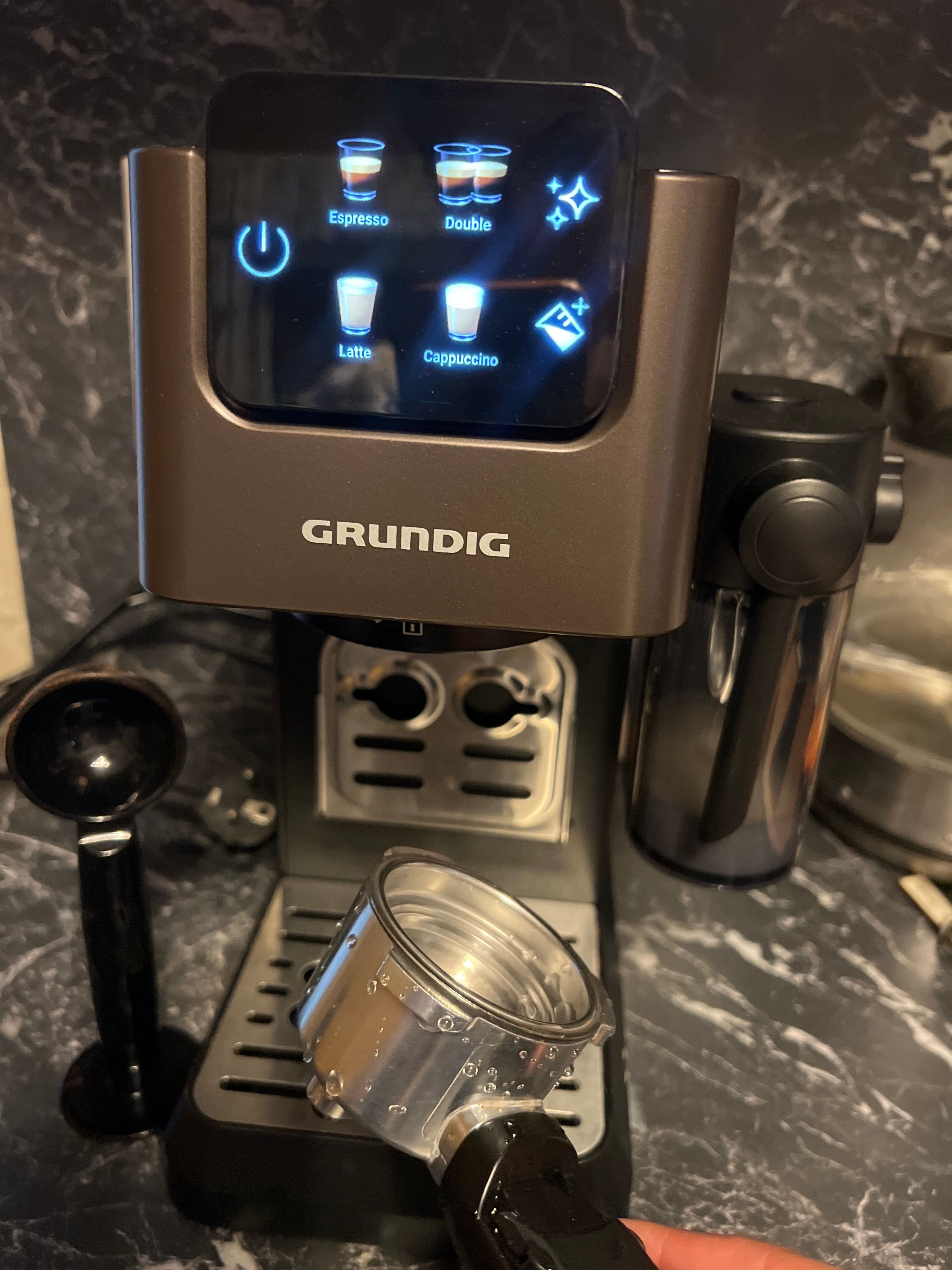 Macht leckeren Cappuccino und Latte Machiato sowie Espresso einfache Bedienung.Bin sehr zufrieden mit der Siebträgermaschine von Grundig.