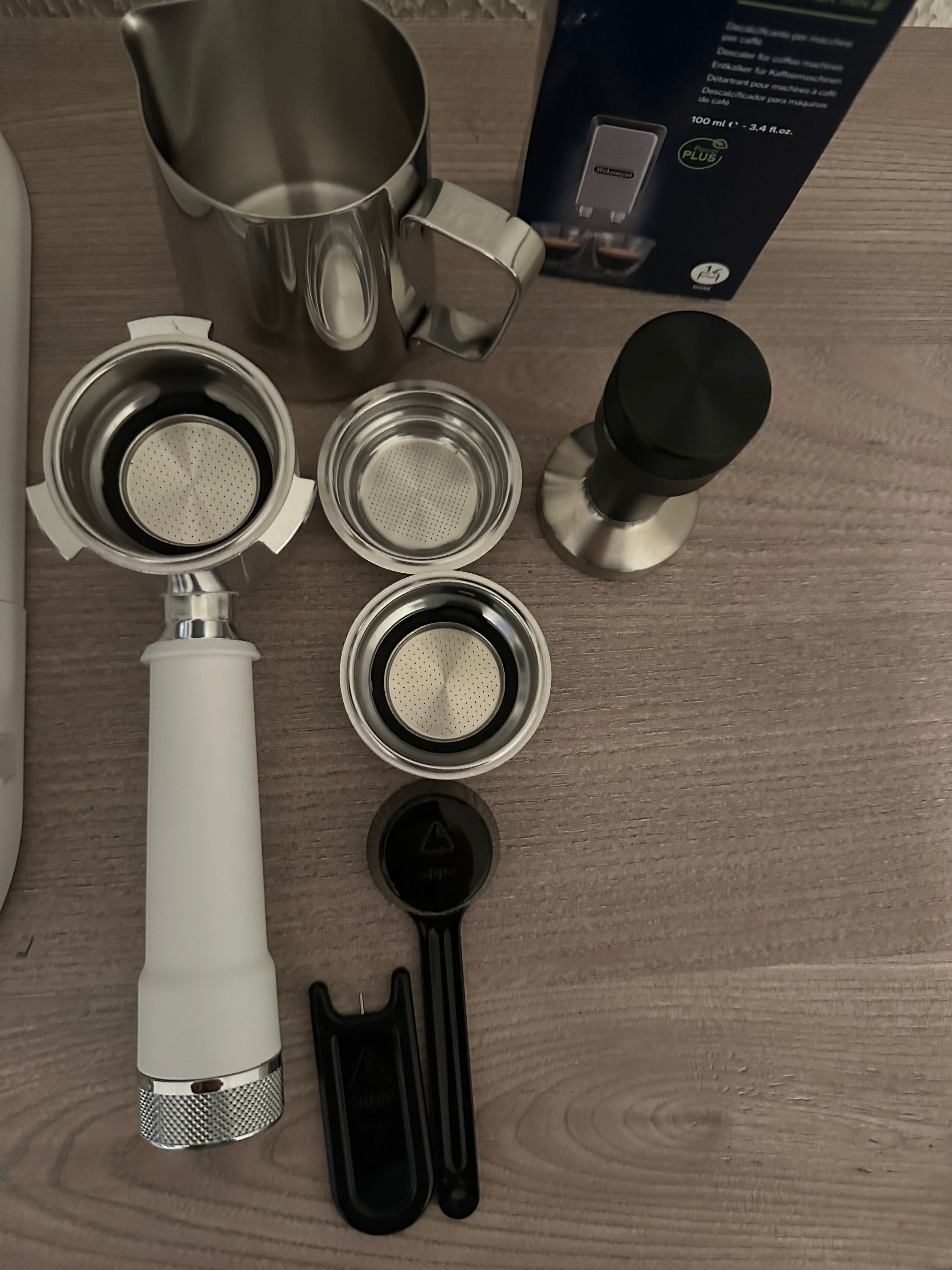 Im Lieferumfang sind Entkalker, Milchkännchen zum Aufschäumen, 3 Filtersiebe / Siebträgereinsätze (1 Tasse, 2 Tassen, E.S.E.-Pad), Tamper und natürlich die Bedienungsanleitung.