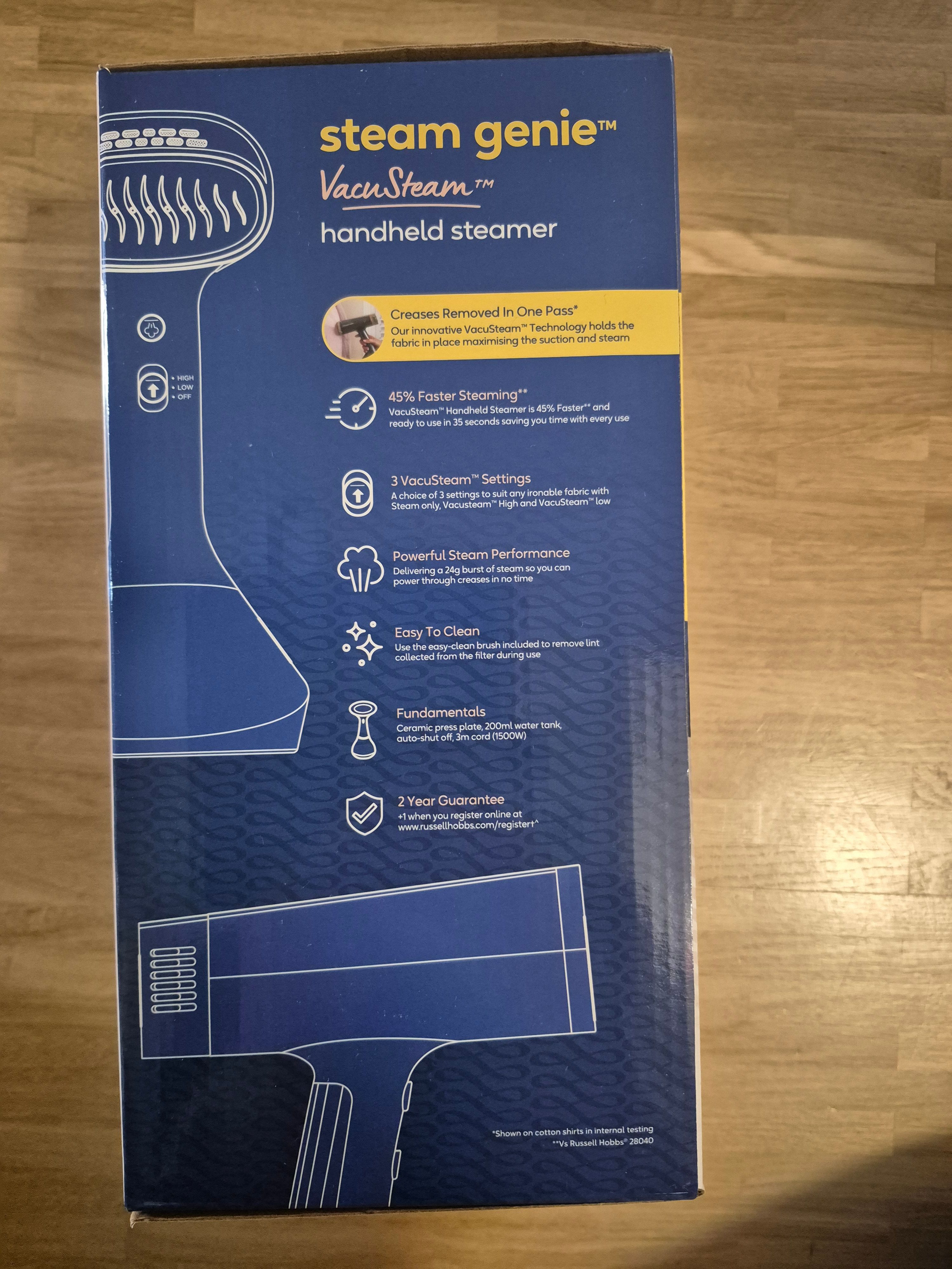 Die Russell Hobbs Steam Genie VacuSteam ist eine Dampfbürste / vertikale Dampffunktion mit VacuSteam-Technologie, d. h. sie kombiniert Dampf und leichte Saugkraft, um den Stoff beim Glätten an die beheizte Keramiksohle zu ziehen – das soll vor allem hartnäckige Falten in einem Zug entfernen.