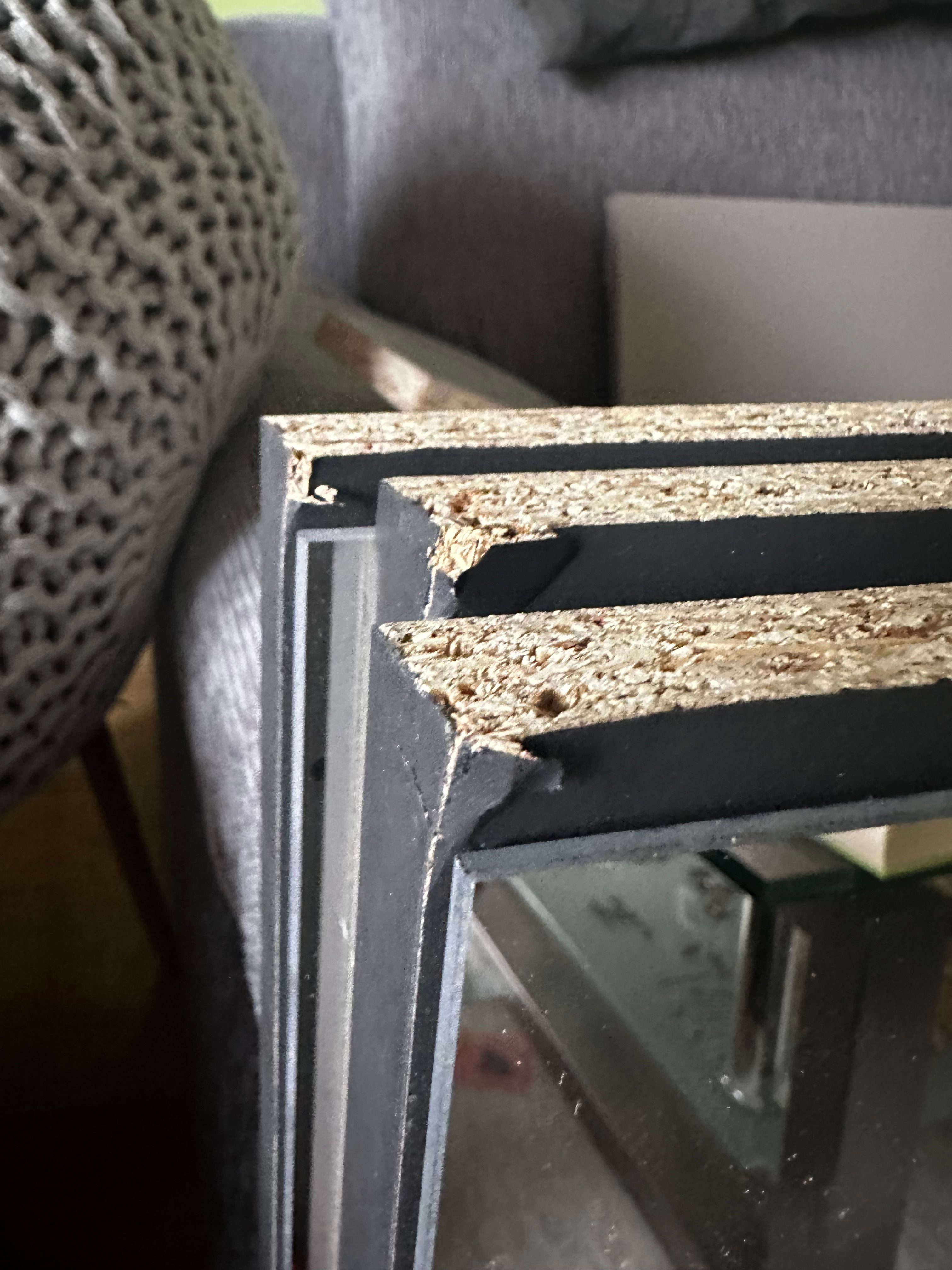 Die Verarbeitung ist deutlich unterhalb des Durchschnitts. Zahlreiche Stellen mit abgeplatztem Furnier, auch im Sichtbereich. Teilweise billigst zusammengeschustert und mit wirklich abenteuerlicher Spanplatte im nicht sichtbaren Bereich zusammengebraten. Das Niveau höchstens auf Discounterlevel, aber vermutlich darunter. Die Spiegel an der Front sind nicht mal gerade verklebt. Spaltmaße nicht im Millimeter, sondern eher im Zentimeterbereich. Die Dekoelemente an den Schubladen sind so billig, dass es fast peinlich ist. Schraubenlöcher z.T. nicht mal vorgebohrt oder zumindest angezeichnet.