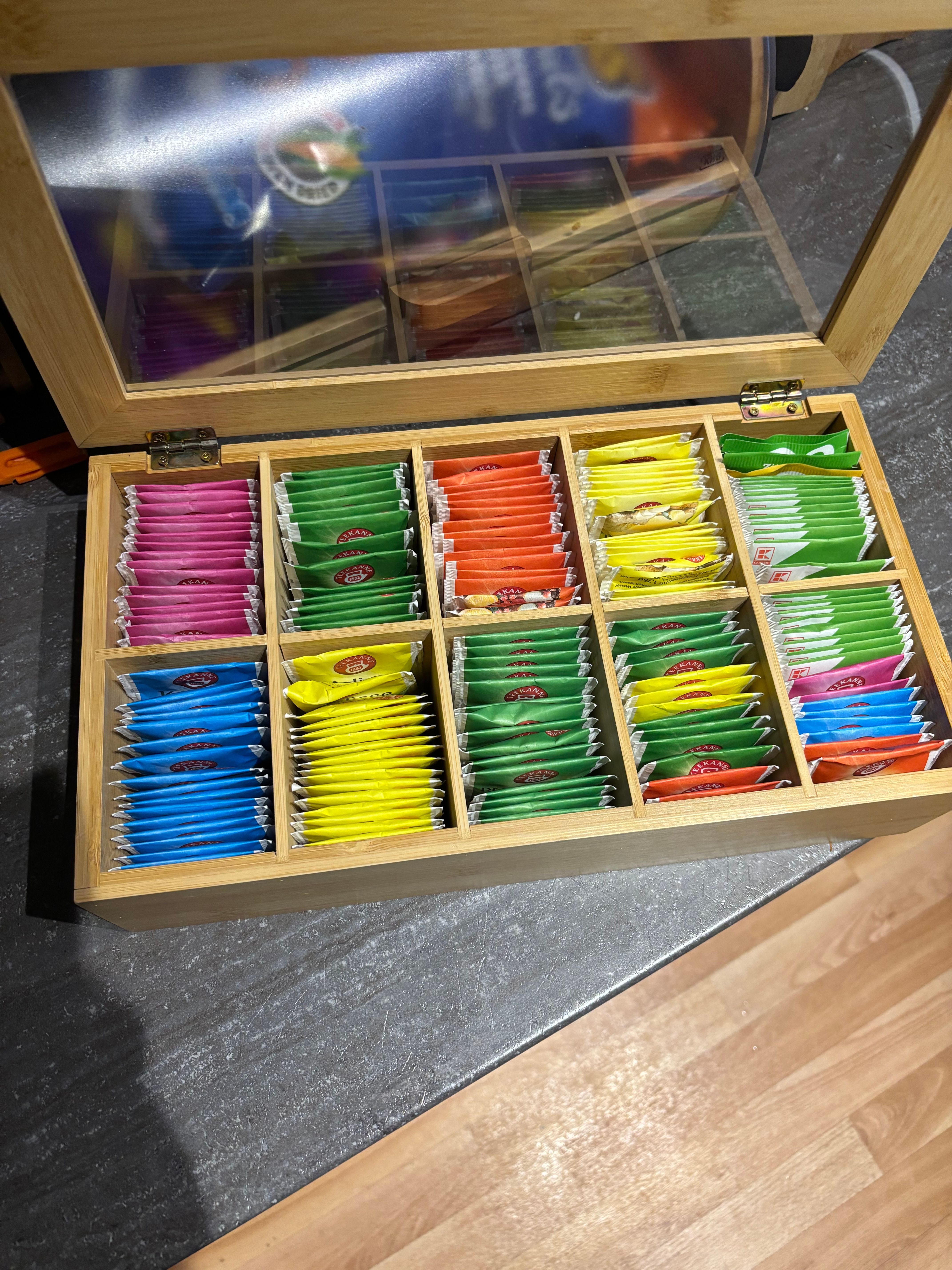 Die Teebox sieht wirklich toll aus und bringt endlich Ordnung in unseren Teeschrank. Viel Platz für viele Teesorten. Macht jetzt viel mehr Freude, Gästen den Tee ihres Gescmacks aussuchen zu lassen.