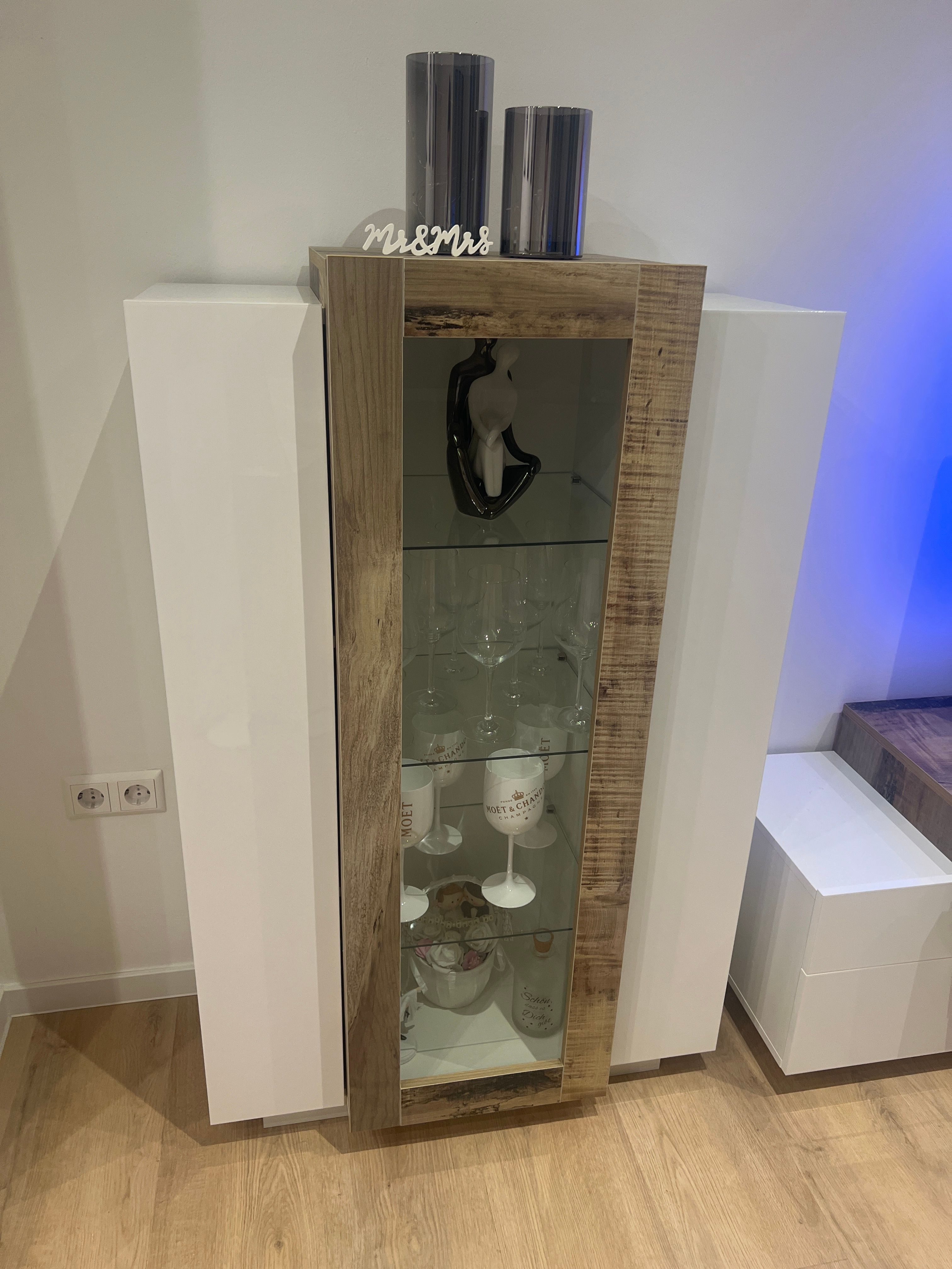 Haben komplettes Set bestellt bestehend aus Wohnwand was eine Vitrine schon hat, noch eine einzelne zusätzliche Vitrine und die passende Kommode. Es sieht einfach sehr Stylisch aus, modern und schön. Aufbau war recht schnell und einfach. Mein Mann hat das ganze Set innerhalb von 4 Stunden aufgebaut. War nichts beschädigt. Was ich aber sagen muss, die ganzen Möbeln sollte man am besten an die Wand dranschrauben da die nach vorbe leicht kippen. Viel Platz und Stauraum. Die Türen sind ja weiss-hochglanz und der rest ist "normal" uns stört es überhaupt nicht.