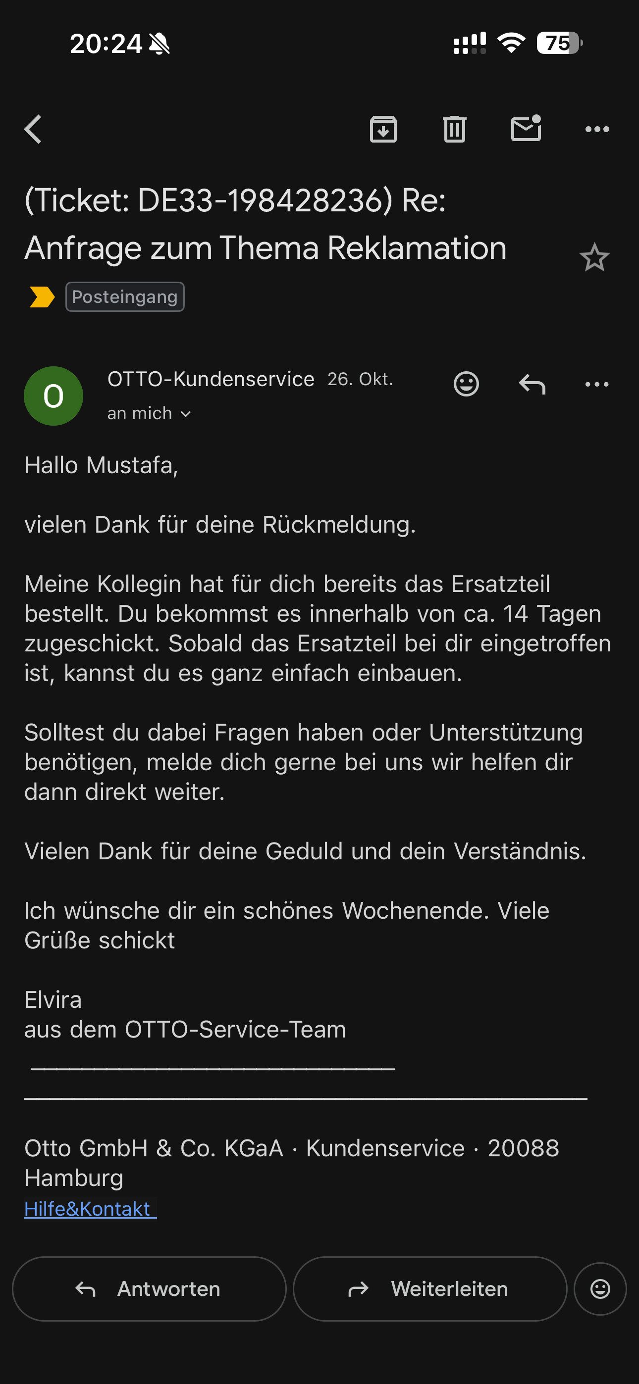 Es gab beschädigte Teile am Lowboard, und ich habe seit dem 25.10. Ersatzteile bestellt. Bis heute, 14.11., ist nichts angekommen. Bis jetzt habe ich auch keine klare Antwort erhalten, wann die Lieferung erfolgen soll.