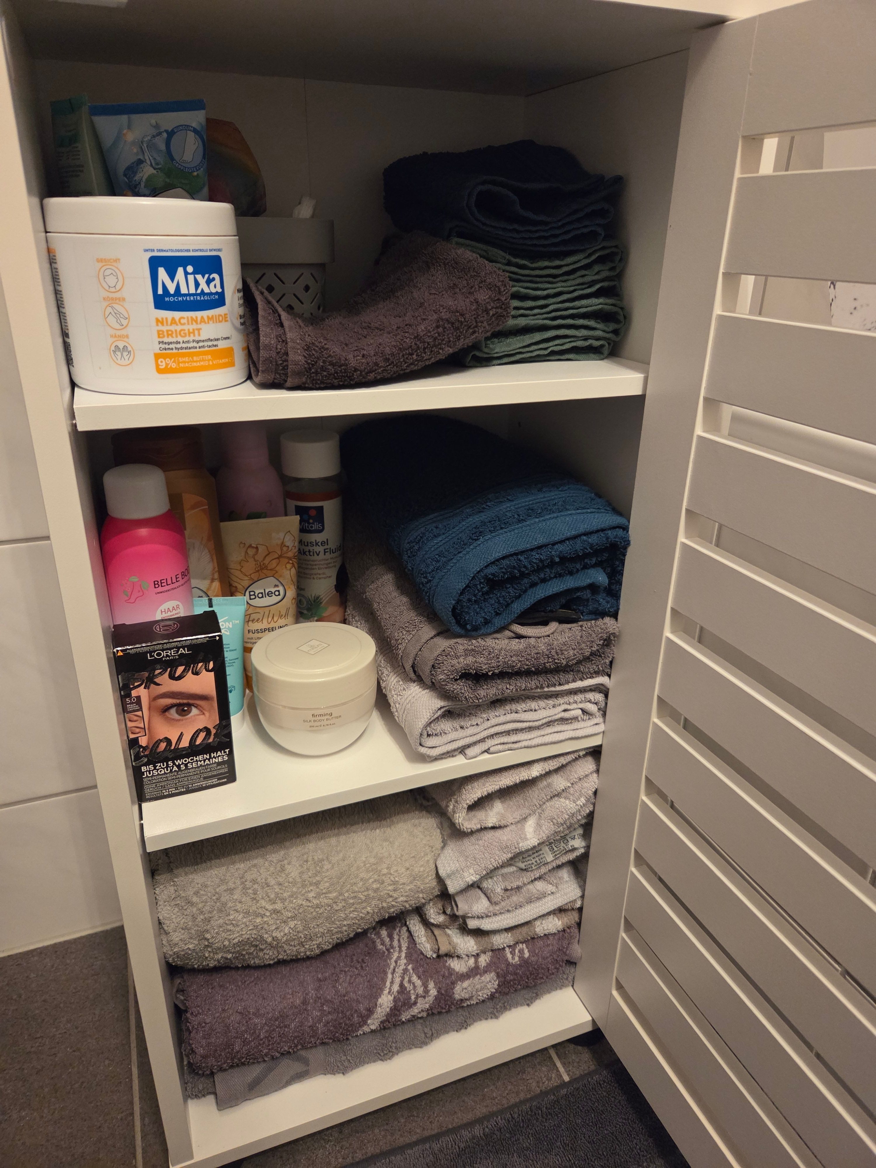 Mega toller hoher Badschrank,viel Stauraum ,Farbe sehr schön ,schöne Stukturen !Kann ihn nur weiterentfehlen ,Aufbau geht sehr schnell !