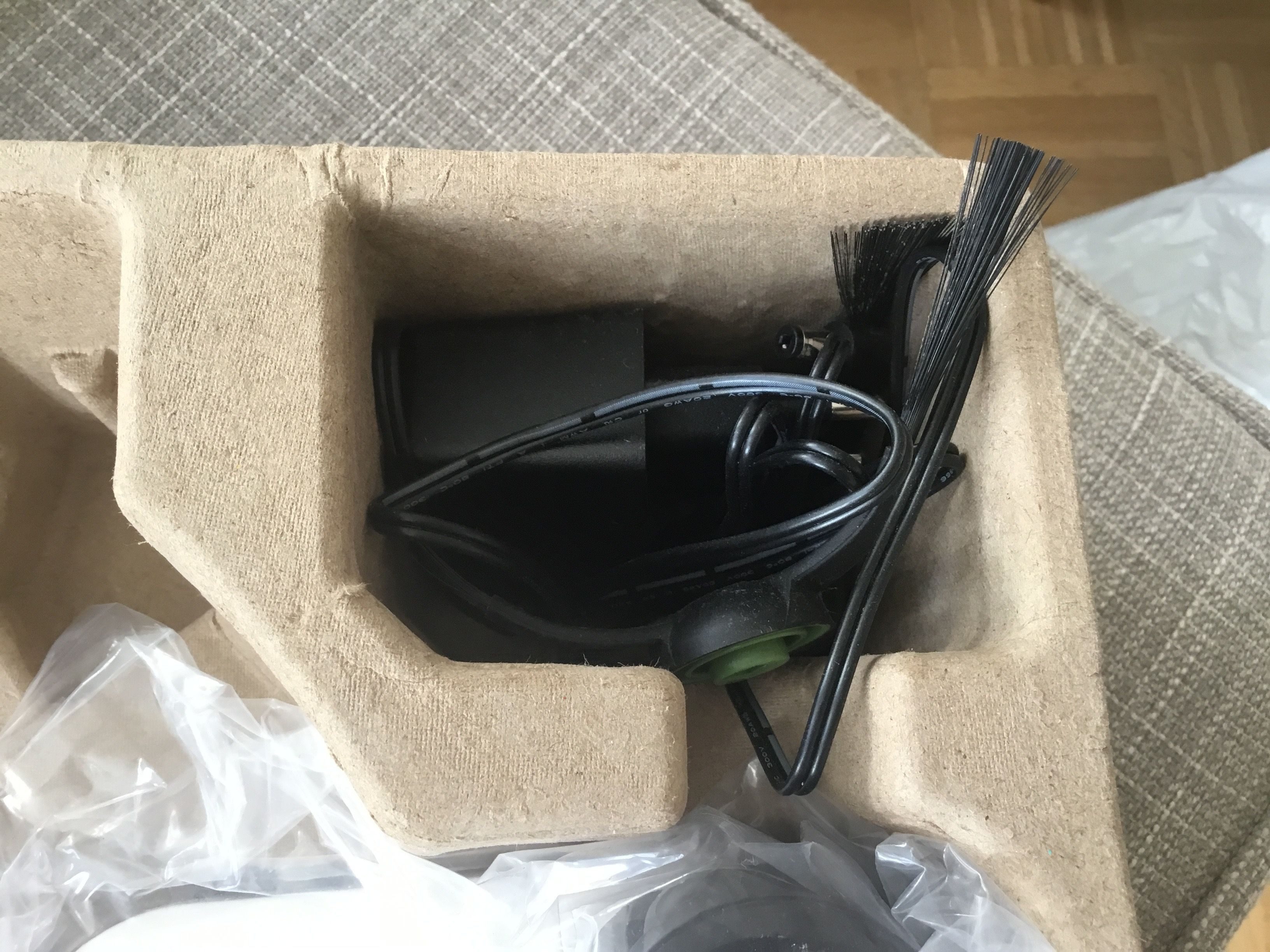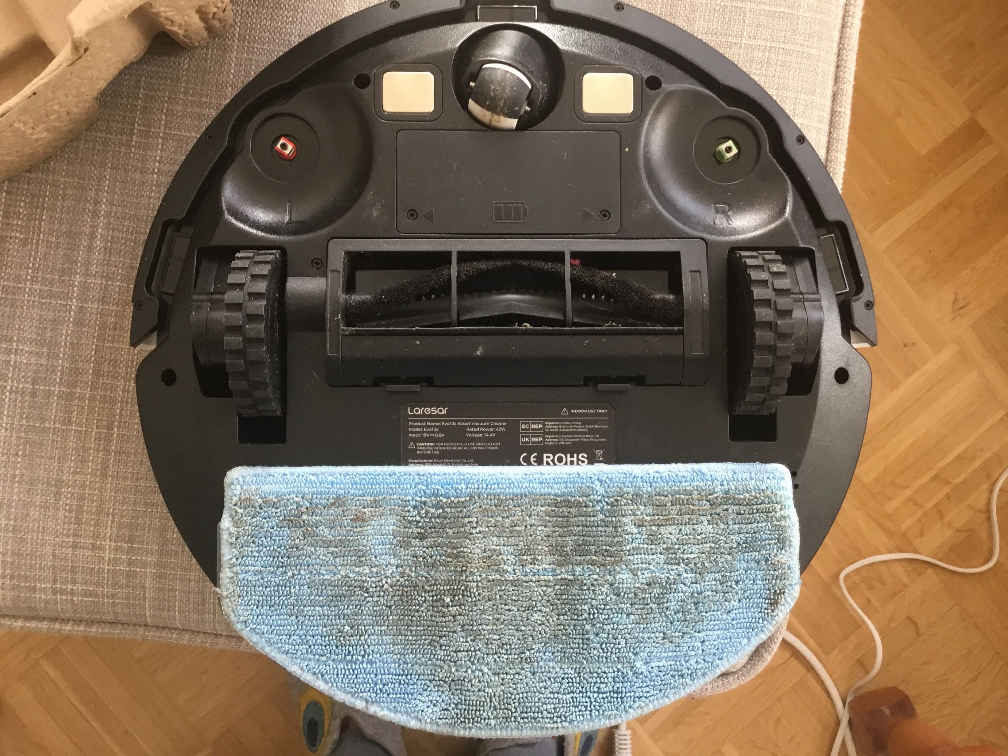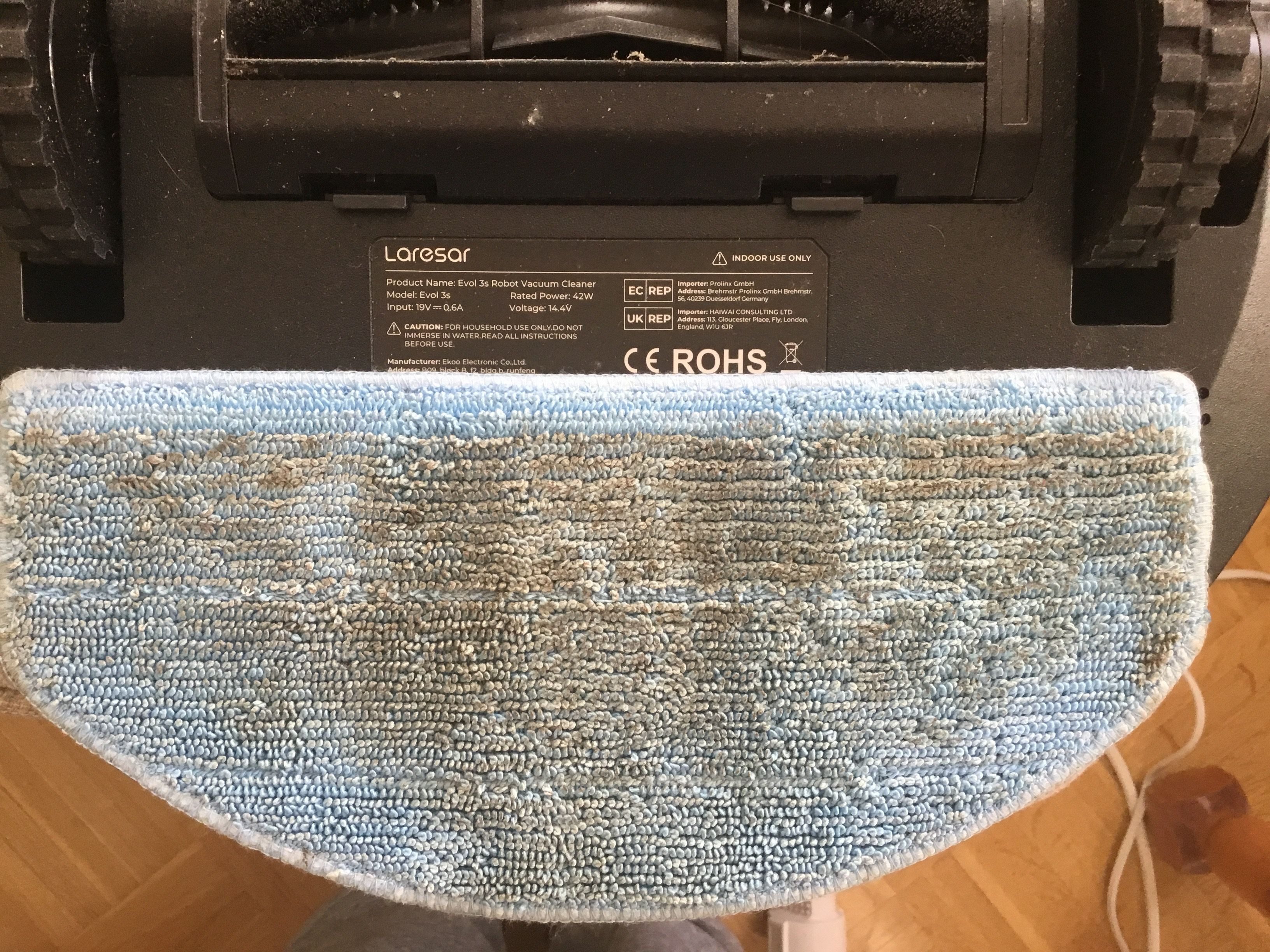 Nicht zu fassen! Saugroboter war gebraucht! Das Wischtuch war fast schwarz, die Bürste war voller Fusseln, der Behälter auch. Das kleine kugelige Rad vorn war auch grau vor Schmutz und die kleinen Besen steckten völlig verbogen zwischen dem Ladekabel