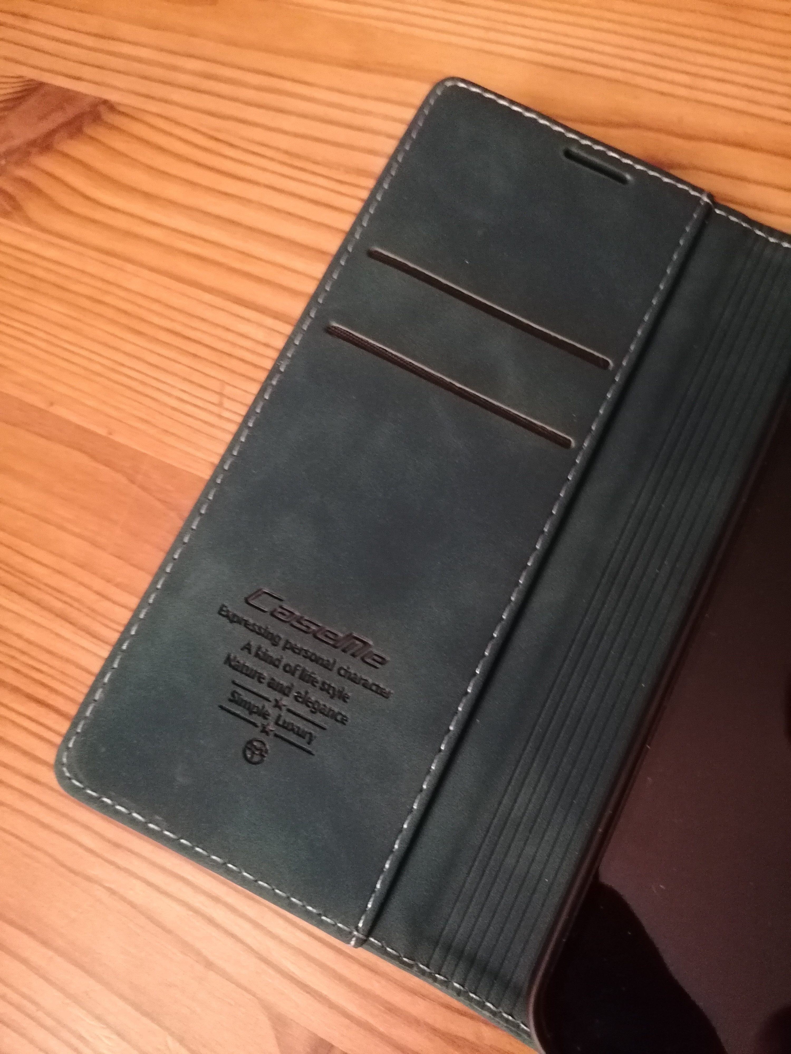 Sehr stabil, schöne Farbe, insegsamt sehr wertig. Magnetverschluss, Kartenfächer, das Handy passt perfekt in das Etui.