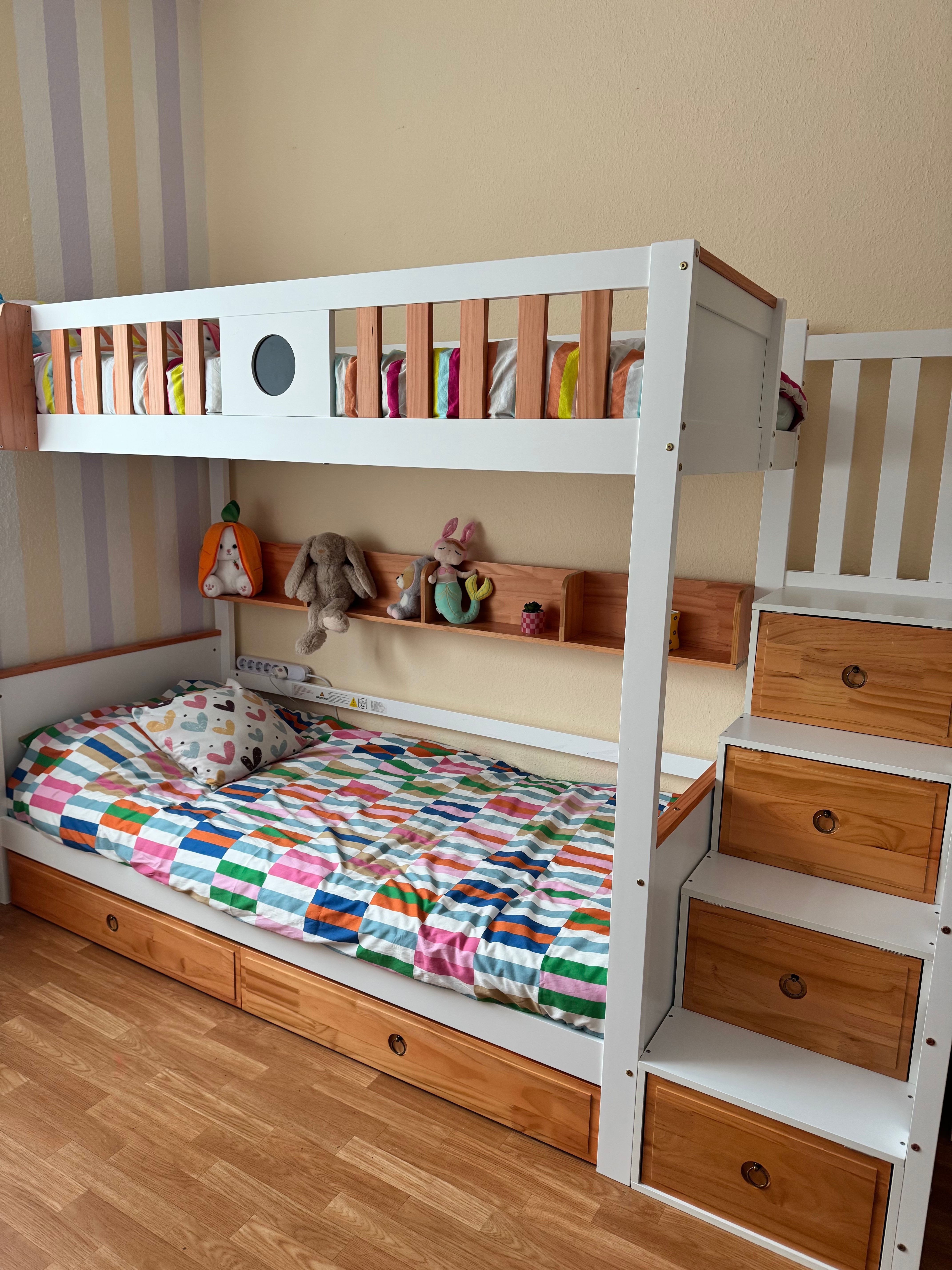 Das Bett ist optisch sehr hübsch, leider ist das auch schon alles. Das Holz auf den Stufen biegt sich seit dem ersten Tag durch, selbst bei meiner 6 jährigen Tochter. Nun ist der Rausfallschutz oben so locker, weil die Schrauben ausgebrochen sind, dass wir neu selber bauen. Selbst ein Querbalken ist angebrochen. Tja, wer günstig kauft, kauft zweimal.