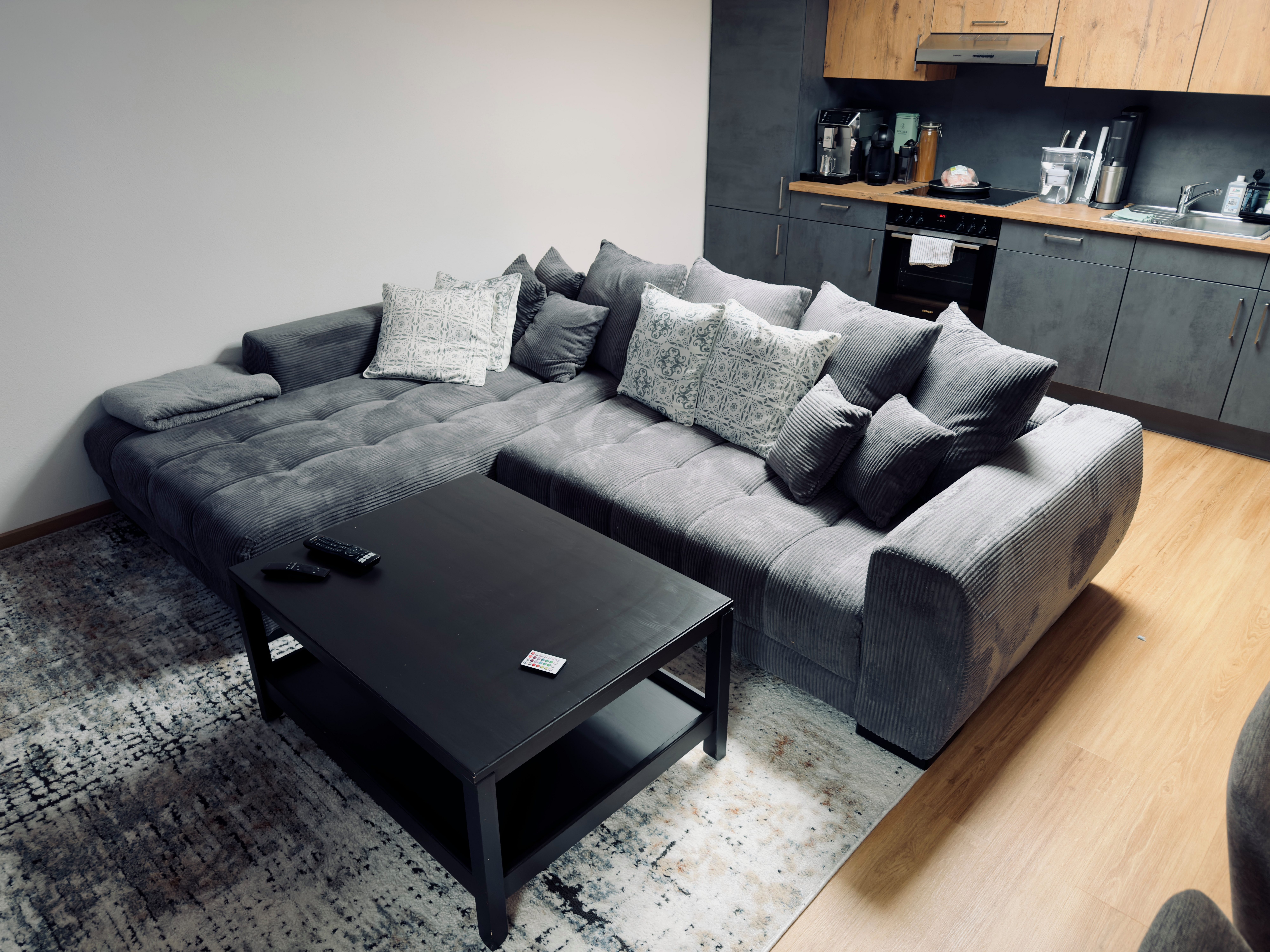 • Design & Optik: Das Anthrazit/Grau wirkt unglaublich edel und zeitlos. Besonders die Cord-Struktur (Breitcord) verleiht dem Wohnzimmer direkt eine gemütliche, aber dennoch moderne Atmosphäre. Sie passt perfekt zu minimalistischen oder industriellen Einrichtungsstilen (wie man sieht, harmoniert sie super mit dunklen Küchenfronten und Holzfußböden).