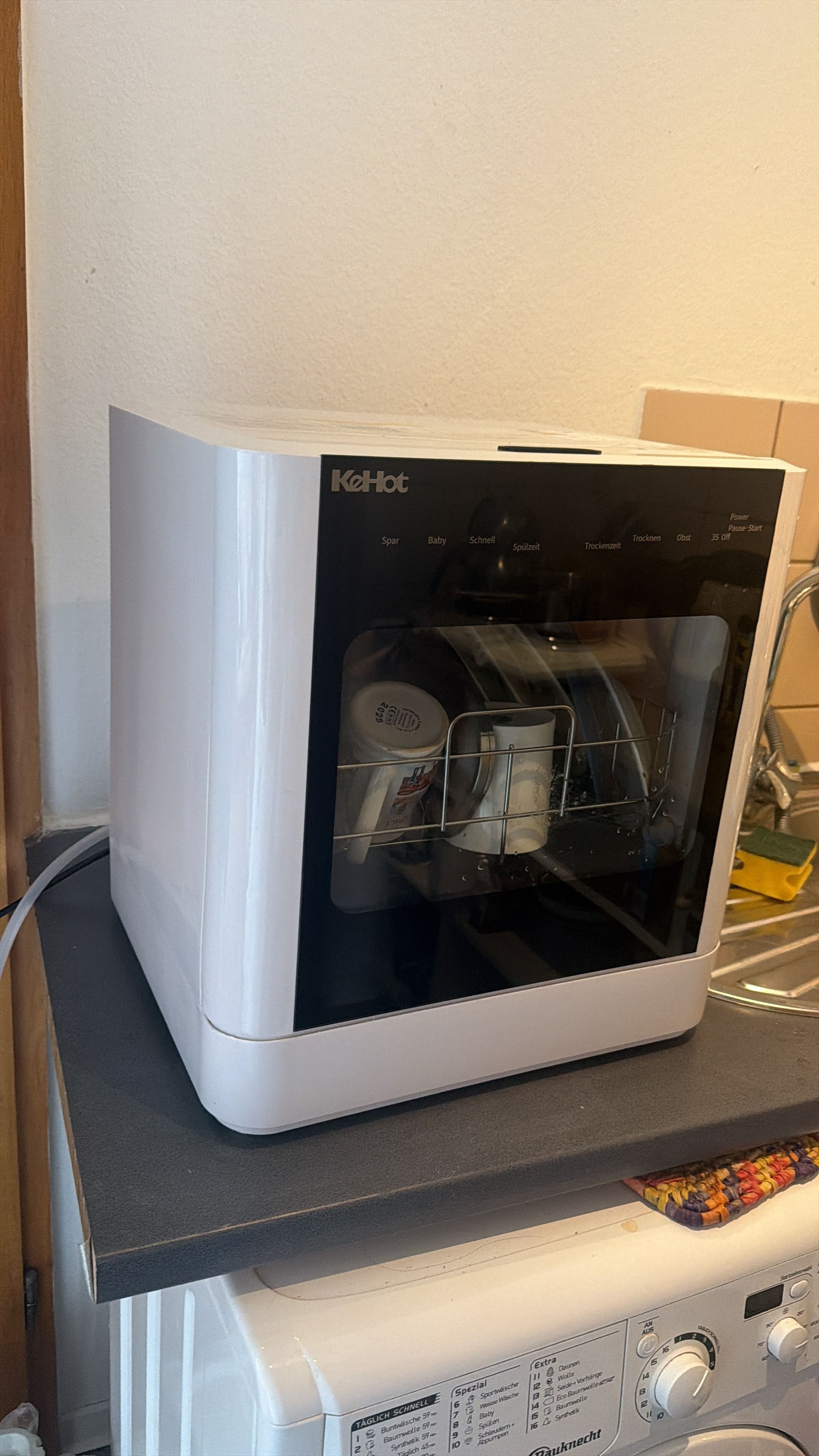 Diese Spülmaschine hat mich überzeugt: sie kommt mit einem für Camping geeigneten Tank, den man aber auch zu Hause nutzen kann, wenn man die Installationen nicht möchte (es gibt da mehrere Möglichkeiten). Man hat dann auch die Kontrolle über den Wasserverbrauch. Das Trocknen ist genial mit UV Licht. Kann ich nur empfehlen.