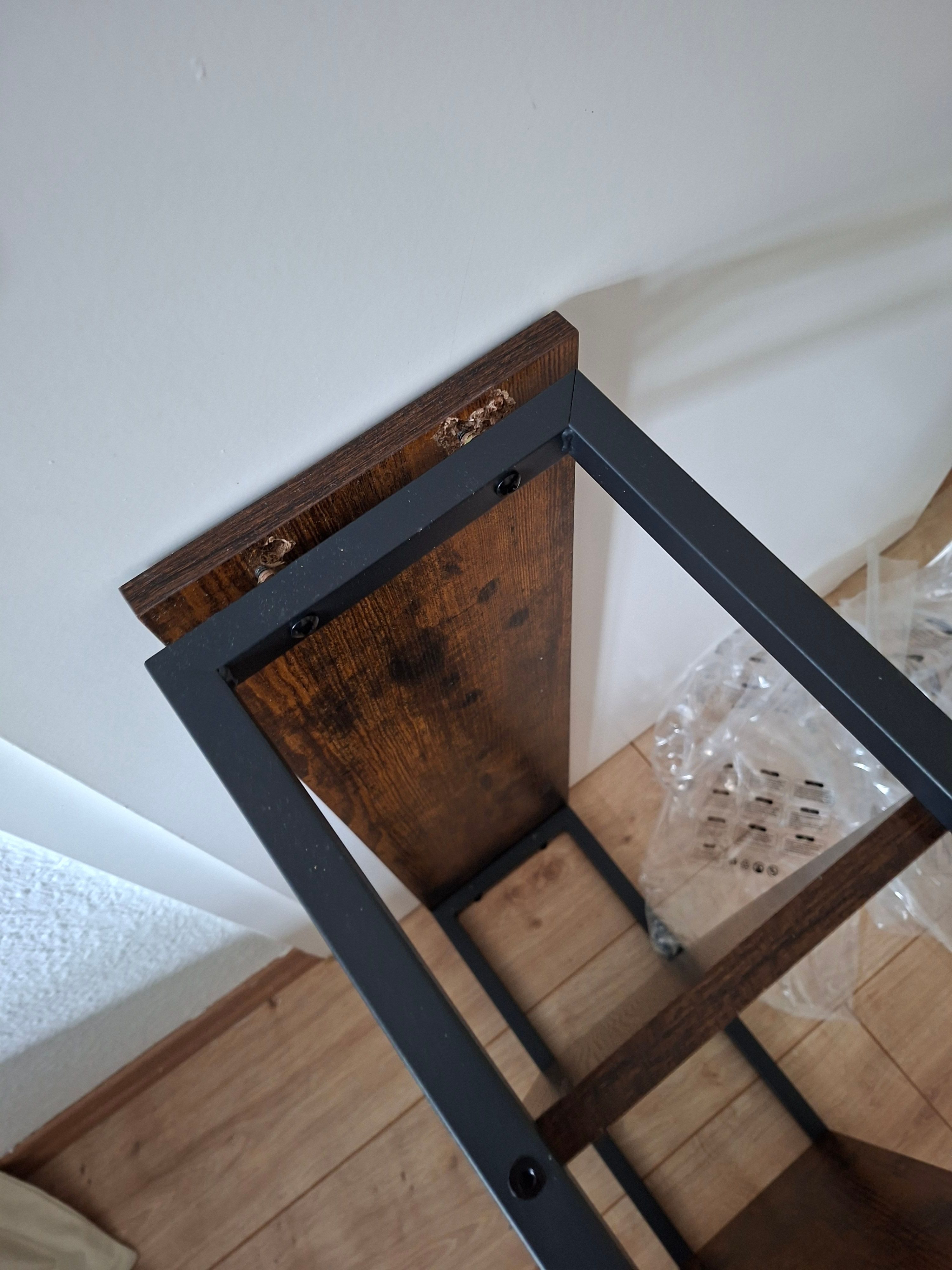 Leider gab es auf einer der Holzflächen Kratzer, und eine der Schrauben war nicht in der Verpackung. Zu Hause habe ich nur eine Schraube gefunden, die ähnlich ist, aber in einer anderen Farbe.