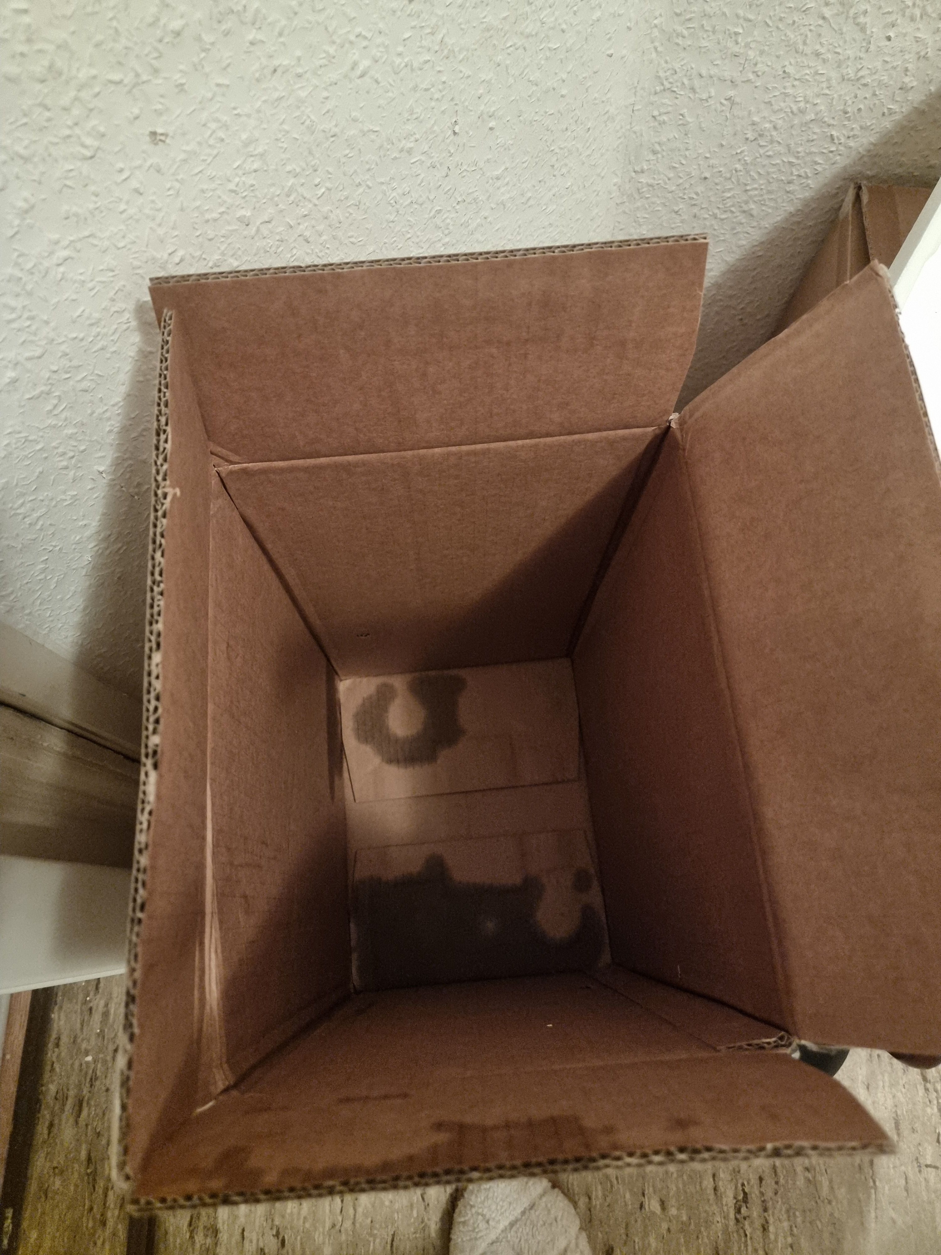 Der Luftentfeuchter kam mit Ölflecken auf dem Karton und fettigen Spuren am Gerät an.
