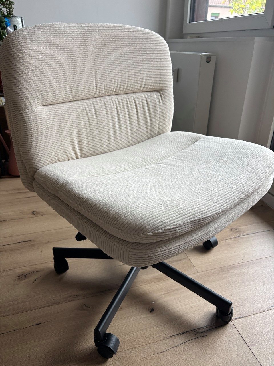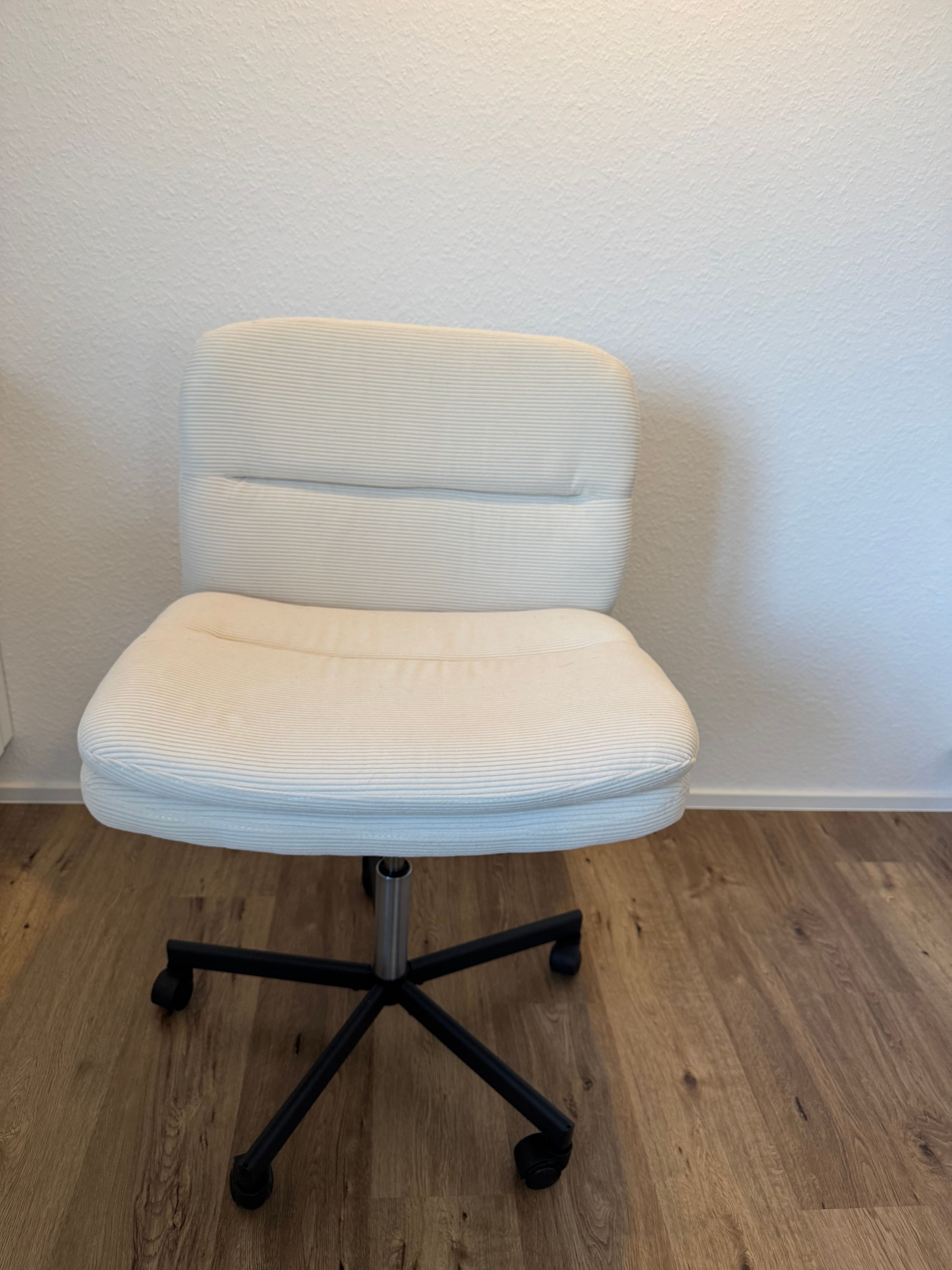 Der Stuhl ist durch die doppelte Polsterung wirklich super bequem und der weiße Samtstoff sieht im Zimmer total edel aus. Besonders praktisch finde ich, dass er keine Armlehnen hat, so kann ich ihn platzsparend komplett unter den Schreibtisch schieben. Er macht einen sehr stabilen Eindruck und die Rollen gleiten flüssig über den Boden. Für den Preis ein echtes Highlight!