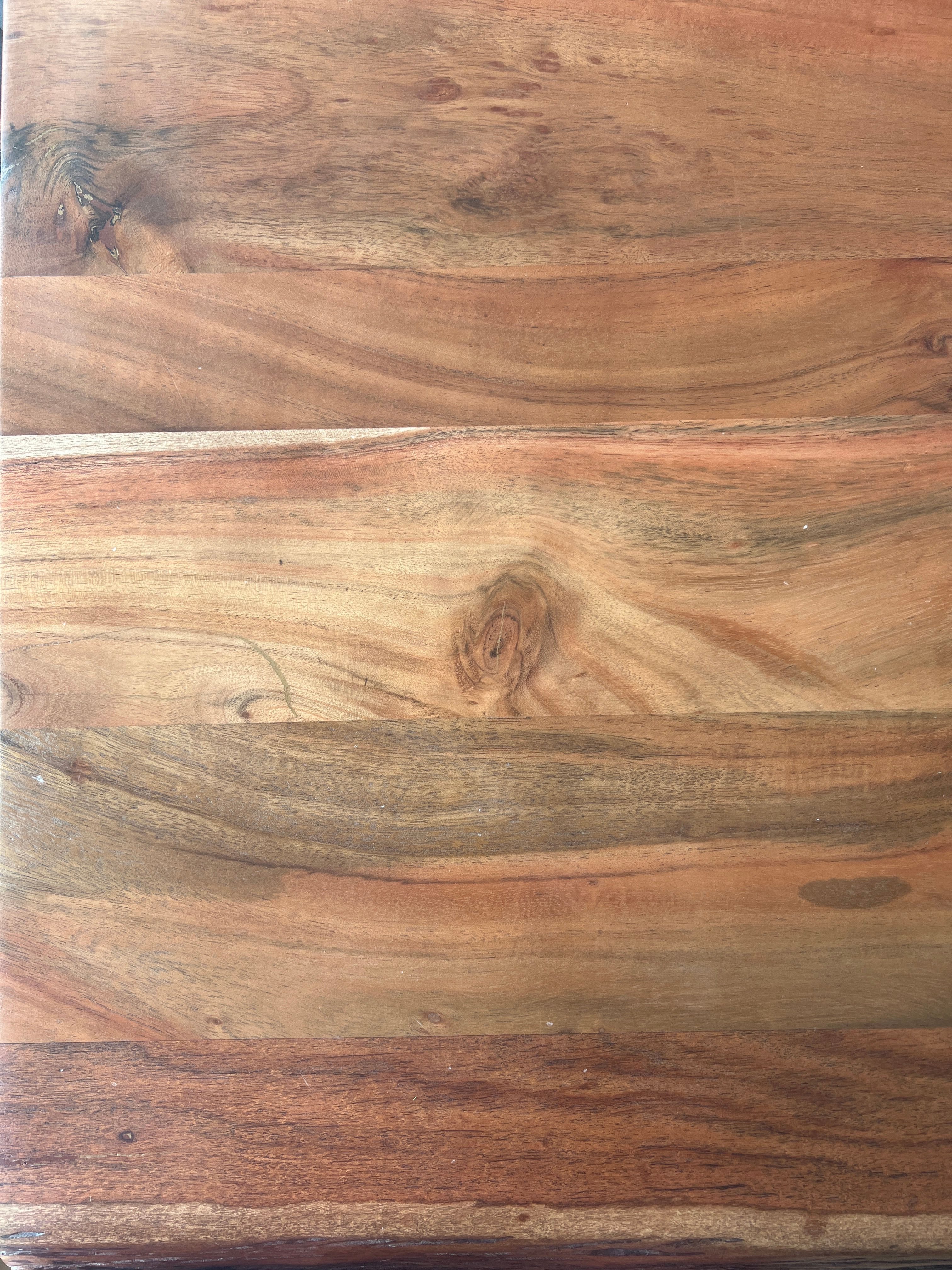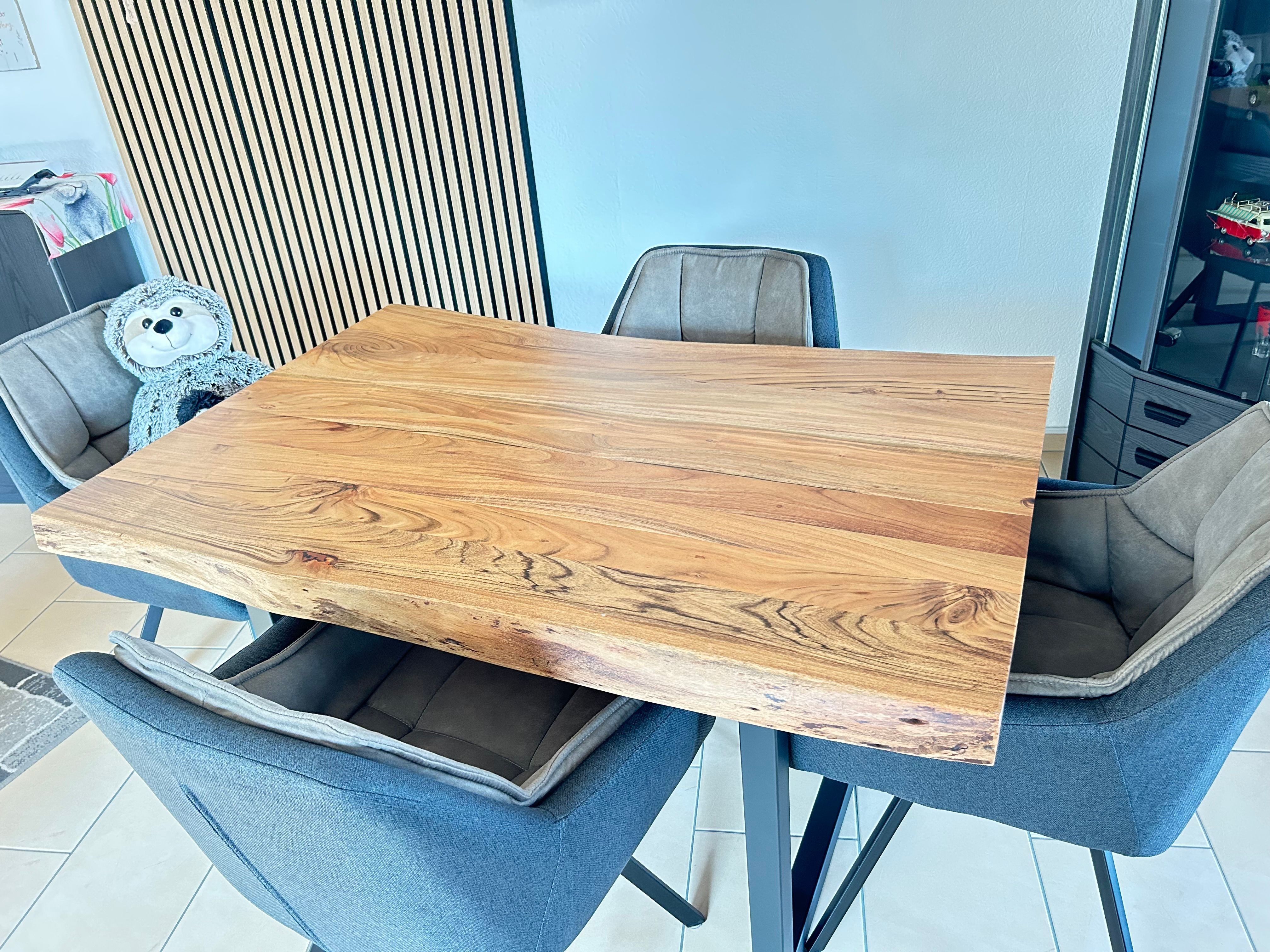 Wunderschöner sehr schwerer Tisch.Massive Akazie.Genau wie abgebildet.Tisch sondert einen Geruch ab vermutlich Wachs oder.ähnl.was auch nach 2 Wo noch nicht verflogen ist.Aber dennoch sehr schön.Einziges Manko ist das die Möbelfundgrube, woher der Tisch kommt, mit Speditionen arbeitet die das liefern bis Bordsteinkante sehr wörtlich nehmen.Auch als Frau allein kann man dann schauen wie man den Tisch ins Haus bringt.